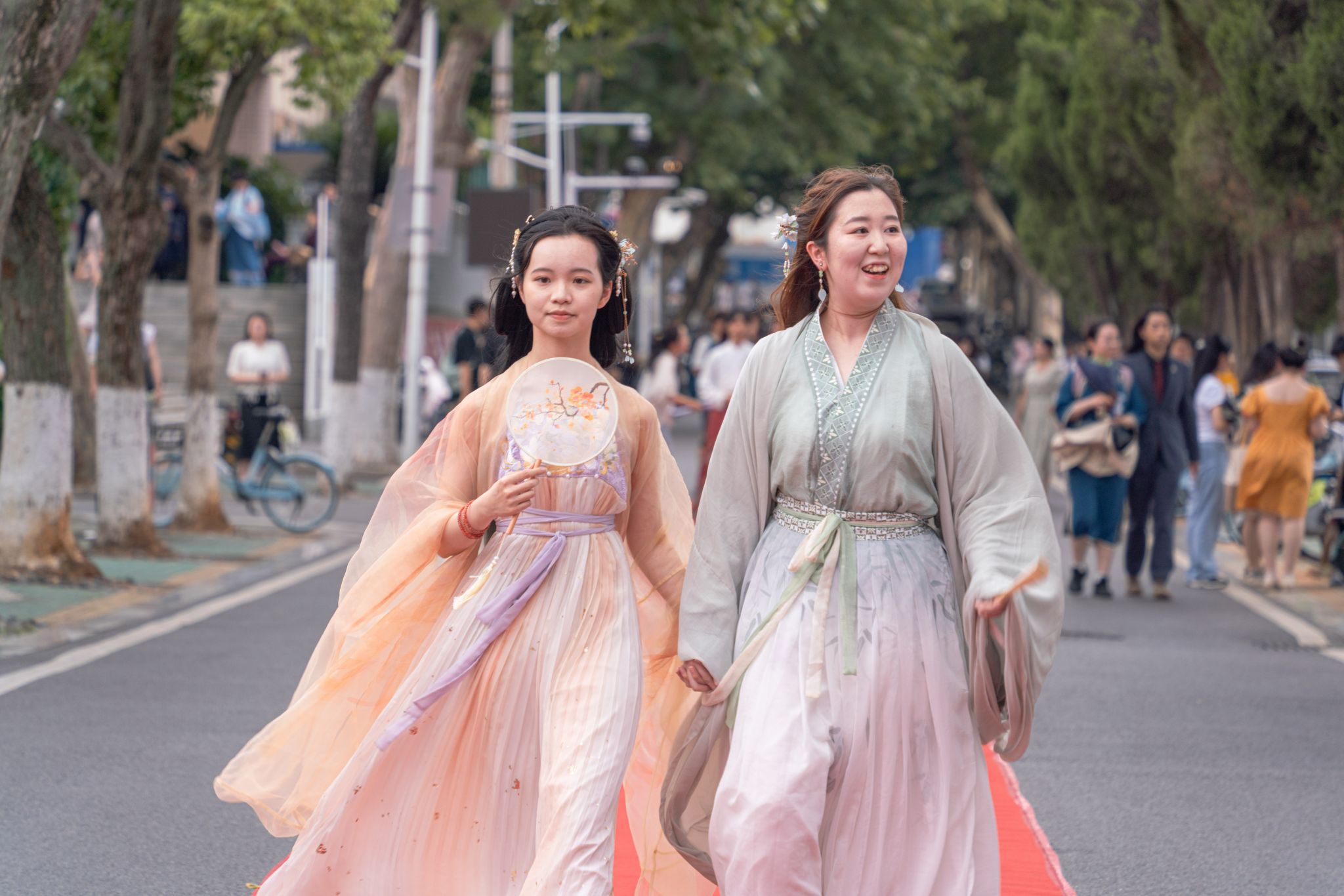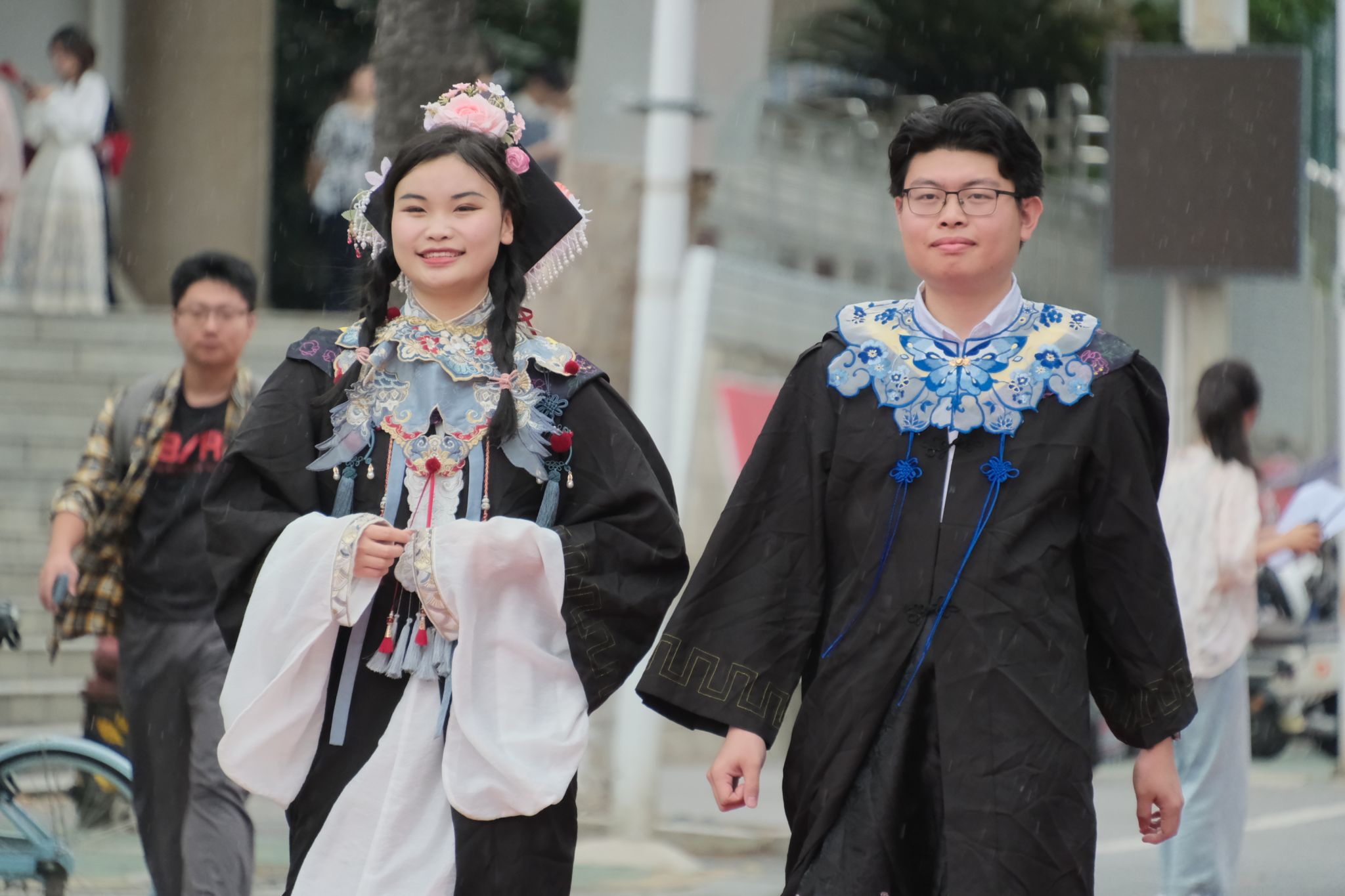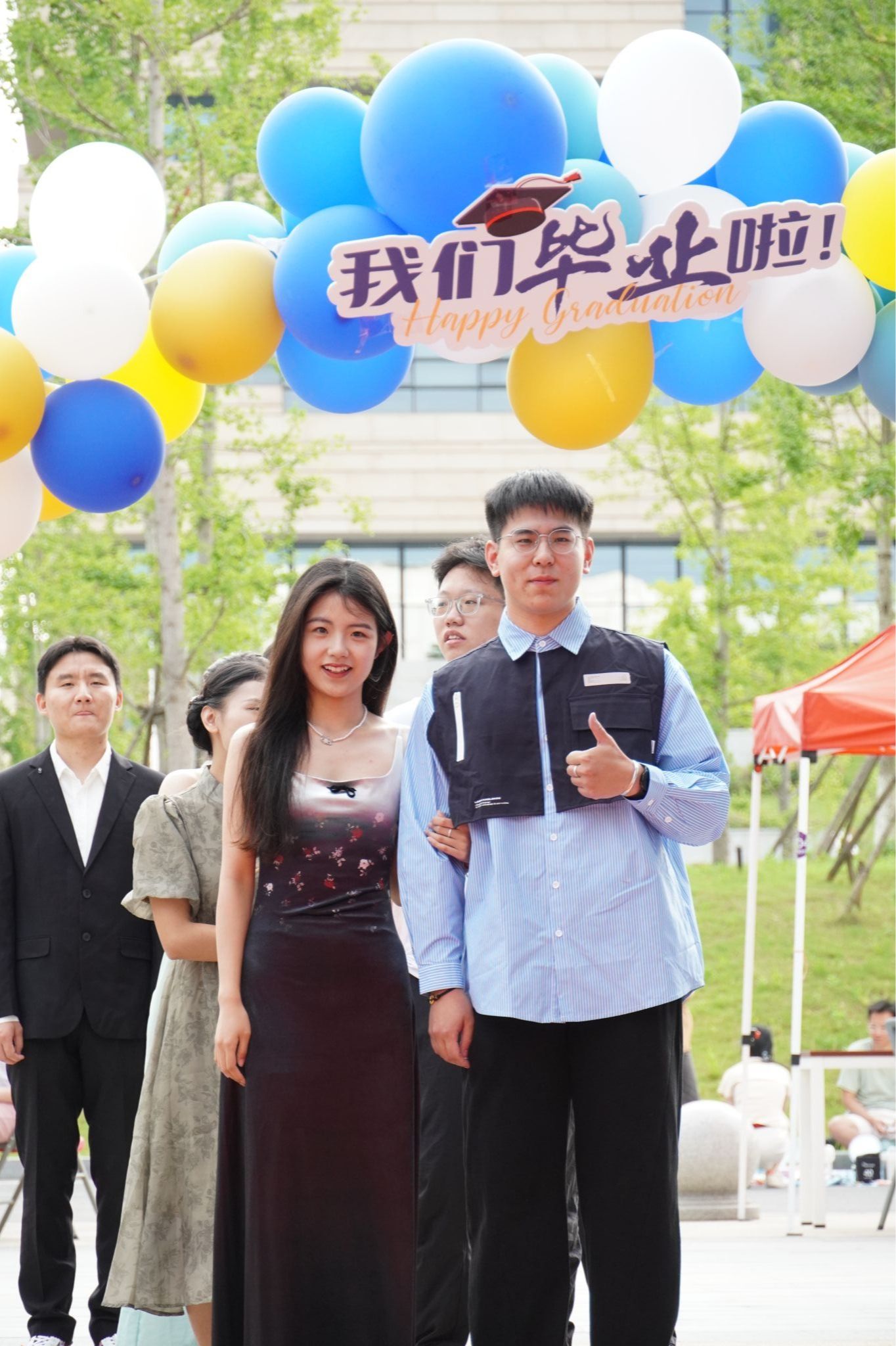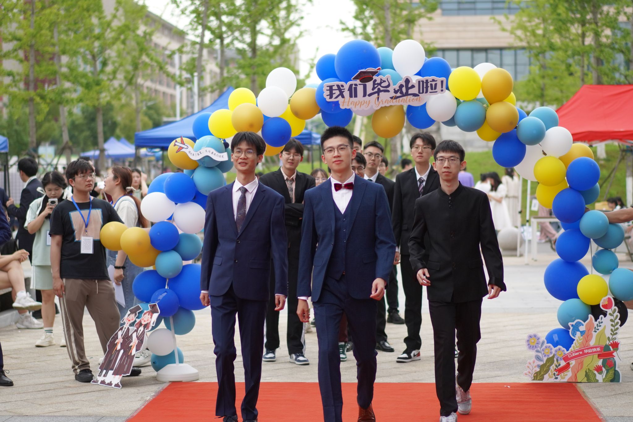 自动化学院赵旋玉同学(左一)穿着国风学位服与同学一同走上红毯,她已保研至本校,曾获美国大学生数学建模大赛M奖,大学生英语能力竞赛铜奖,英语演讲比赛全国三等奖。赵旋玉同学鼓励学弟学妹们“合理规划时间,提升学习效率,劳逸结合才能事半功倍。”
