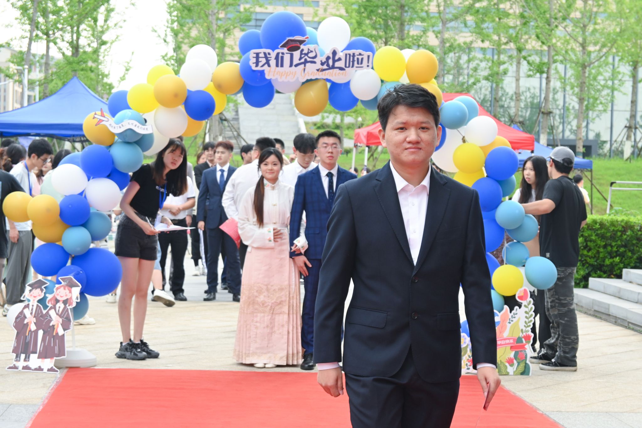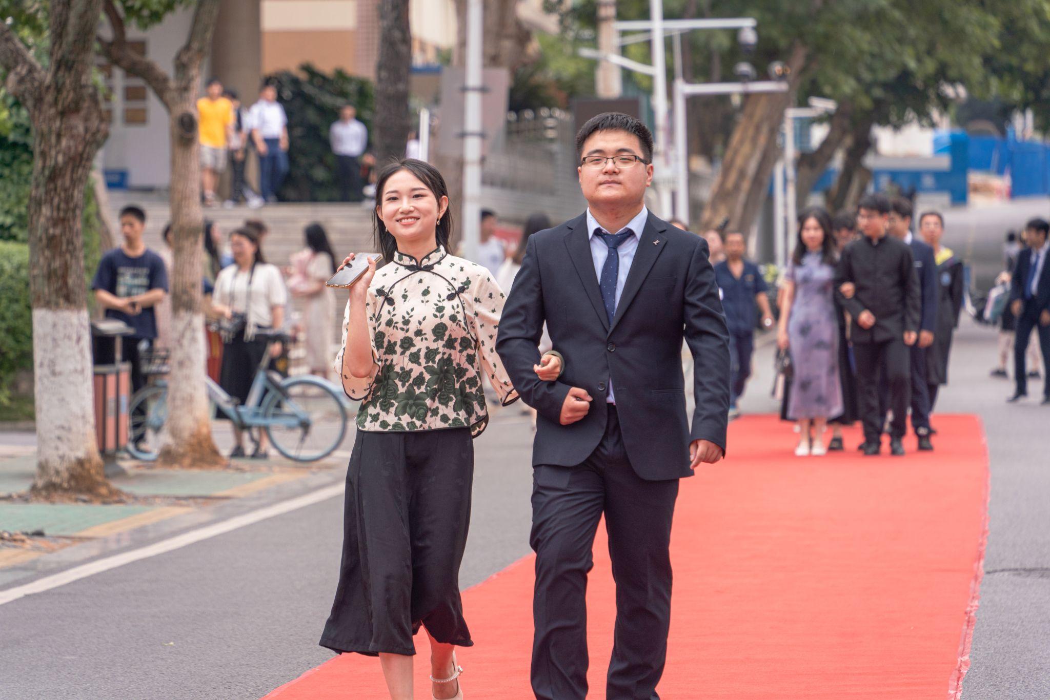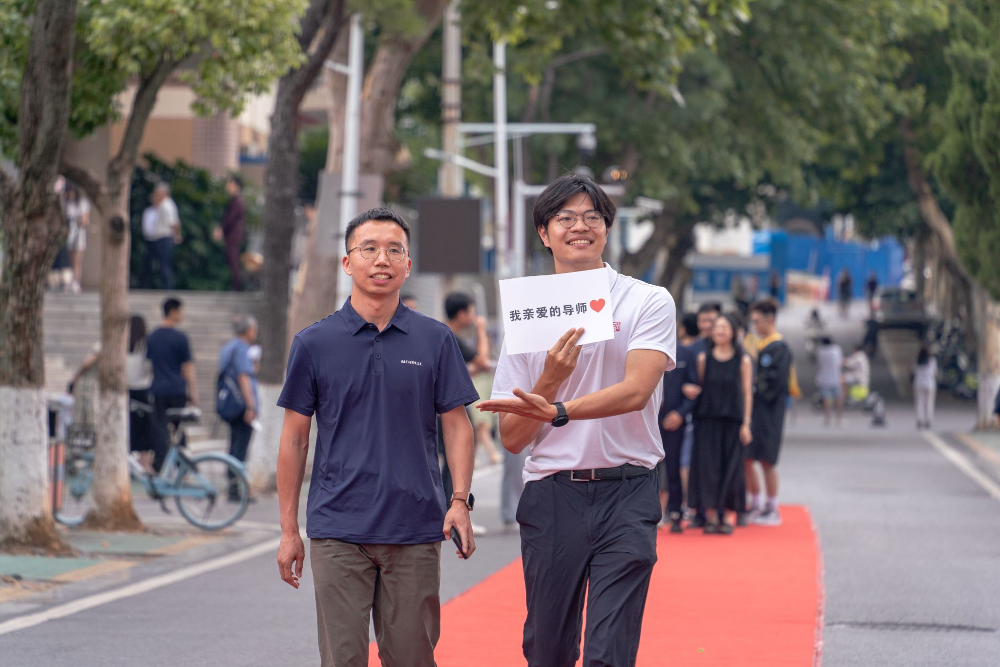 工程学院硕士毕业生贾彦平与导师郭良杰副教授并肩走上红毯。他表示,毕业红毯必须要跟自己的“伯乐”一起走。感谢老师从本科时期就一直耐心地培养他,让他成为了一个优秀且上进的新一代年轻人。郭良杰副教授说,学生与老师本为一体,相互促进、相互成就。在未来的日子里,他也会继续保持这份初心继续与学生相处。