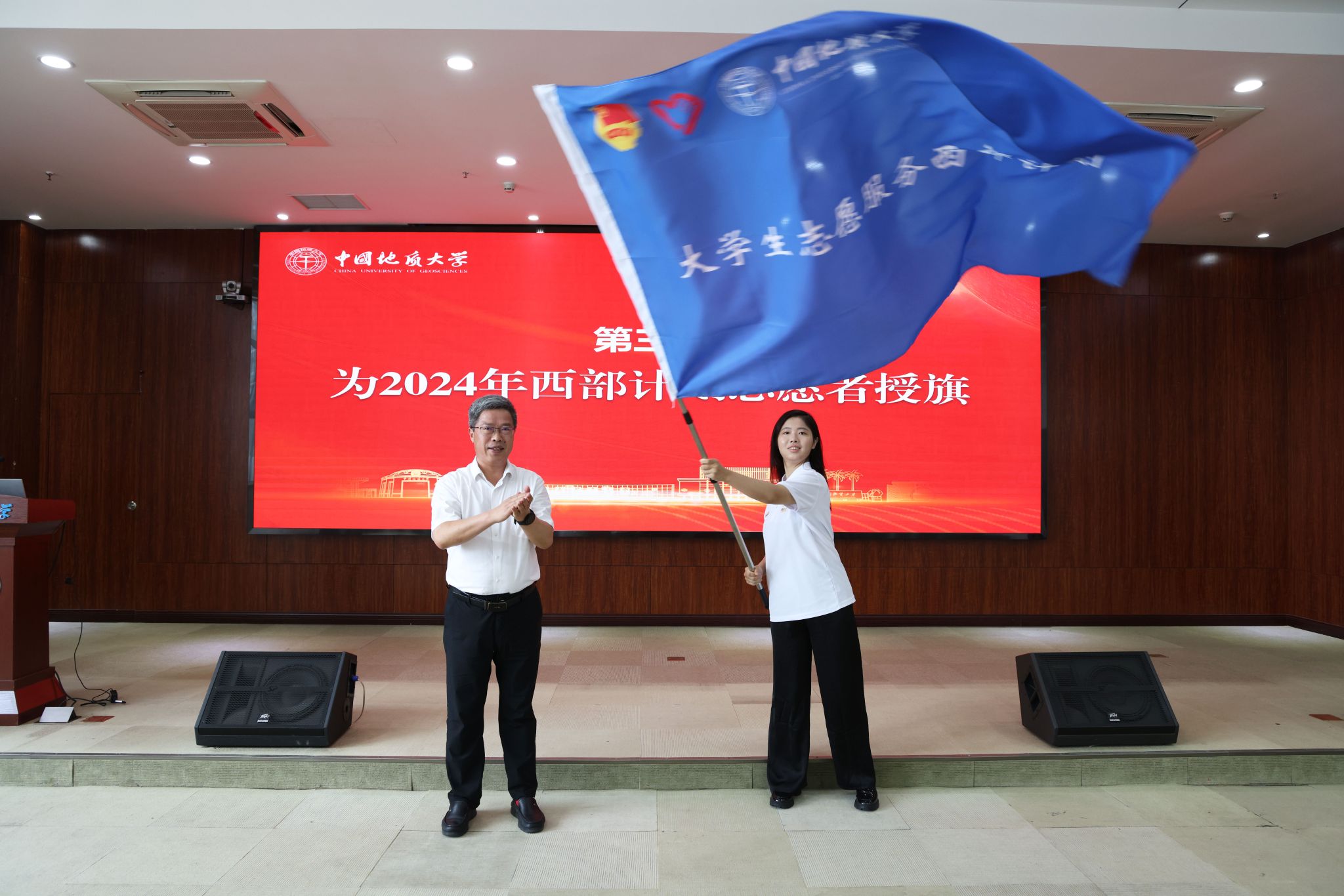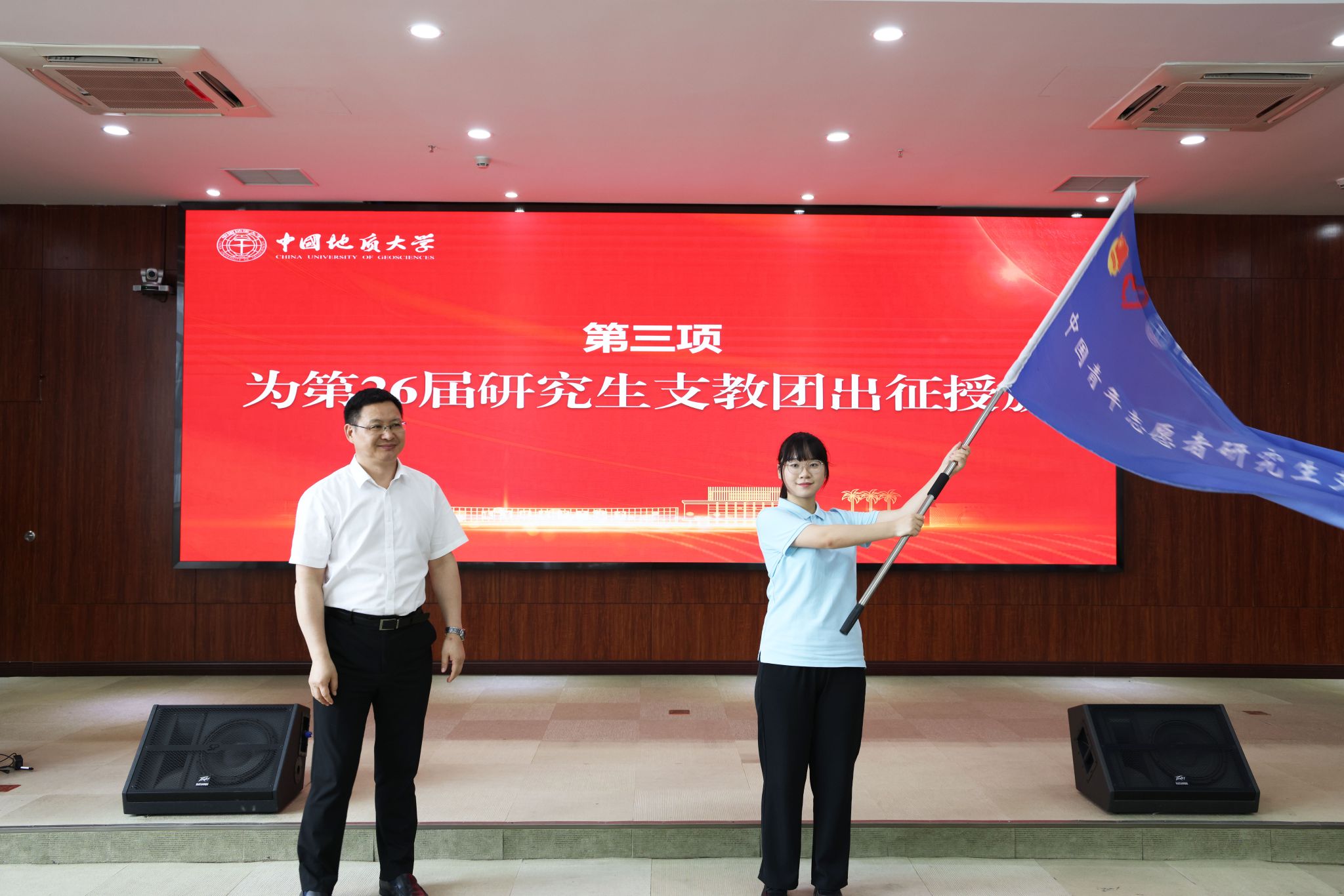 在出征仪式上,刘杰为第26届研究生支教团授旗,王华为2024年西部计划志愿者授旗。11位研究生支教团成员、20名西部计划志愿者将奔赴新疆维吾尔自治区、新疆生产建设兵团、西藏自治区、云南楚雄、湖北巴东等12个省(自治区、直辖市)开展志愿服务和支教活动。