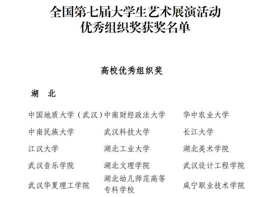 据悉,全国大学生艺术展演活动每三年举办一届,是教育系统举办的规模最大、规格最高、影响最广的艺术实践活动。本届艺术展演于2023年2月至2024年6月举办,以“厚植家国情怀,涵养进取品格”为主题,旨在展示当代大学生与时代同向、与祖国同行、胸怀家国创未来的价值追求,展演活动分为省赛和国赛两个环节,涵盖声乐、器乐、舞蹈、戏剧(戏曲)等多个艺术表演类和艺术作品展、艺术实践工作坊、优秀案例等项目。在之前的湖北省赛中,学校选送的作品获一等奖5项、二等奖4项、三等奖1项,学校获评湖北省优秀组织单位。