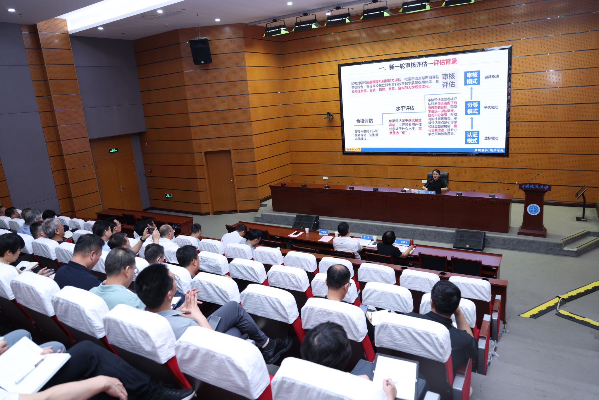 肖静以《紧扣指标 悟透内涵 明确定位 提质增效——新一轮教育教学审核评估工作解析》为题,从新一轮审核评估的背景与特点、武汉理工大学审核评估探索与实践、数字化赋能“教学评管建”的思考、审核评估线上评估具体任务等4个方面,全方位介绍审核评估工作,重点介绍了关键任务、不同节点应注意的事项。她说,教育教学审核评估是党政统一领导、部门协同、校院共同推进的重要工作,各职能部门、各学院主要负责人是第一责任人,要深刻理解审核评估的内涵和目标,要主动思考在“立德树人”“三全育人”的中的担当和贡献。
