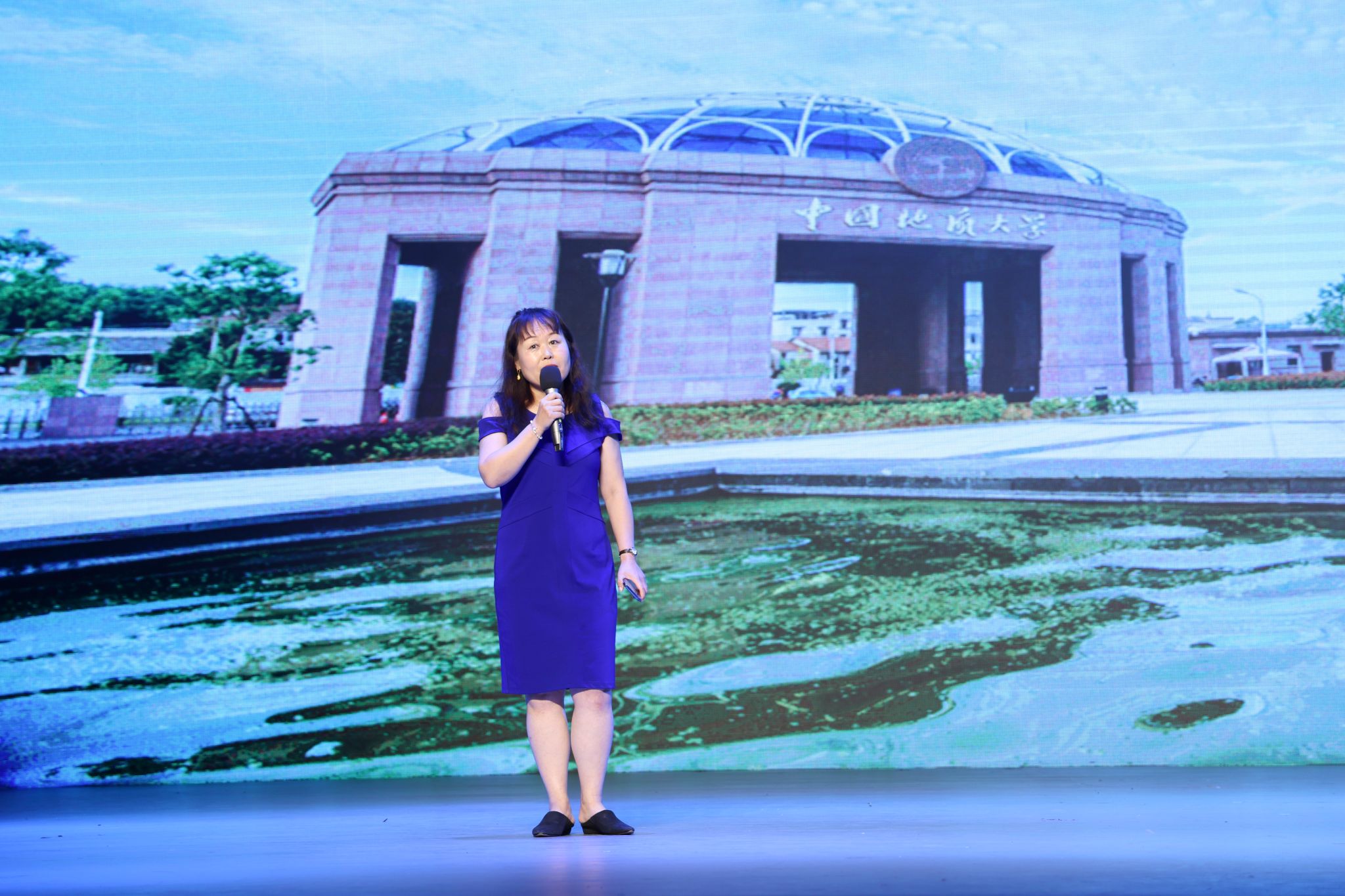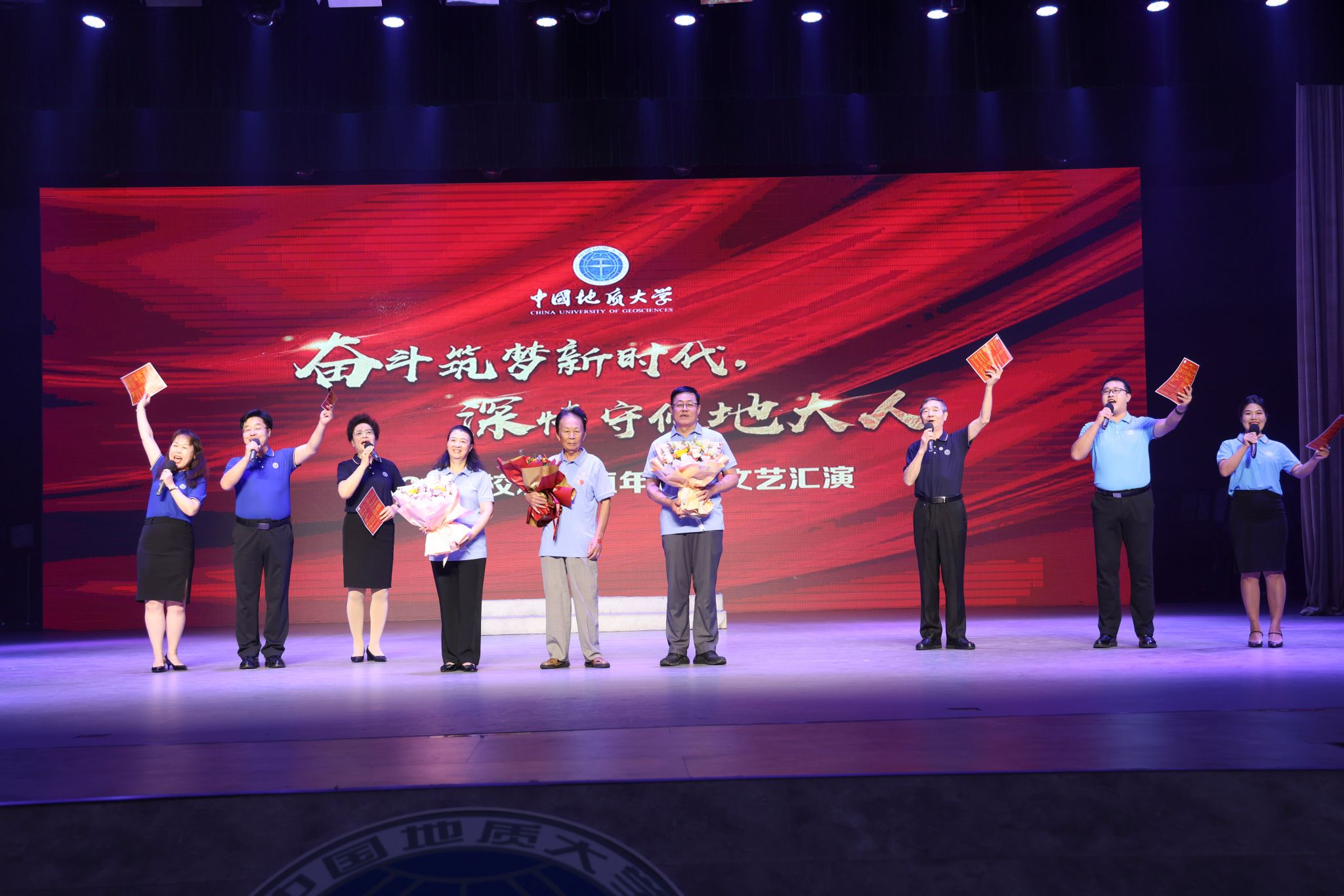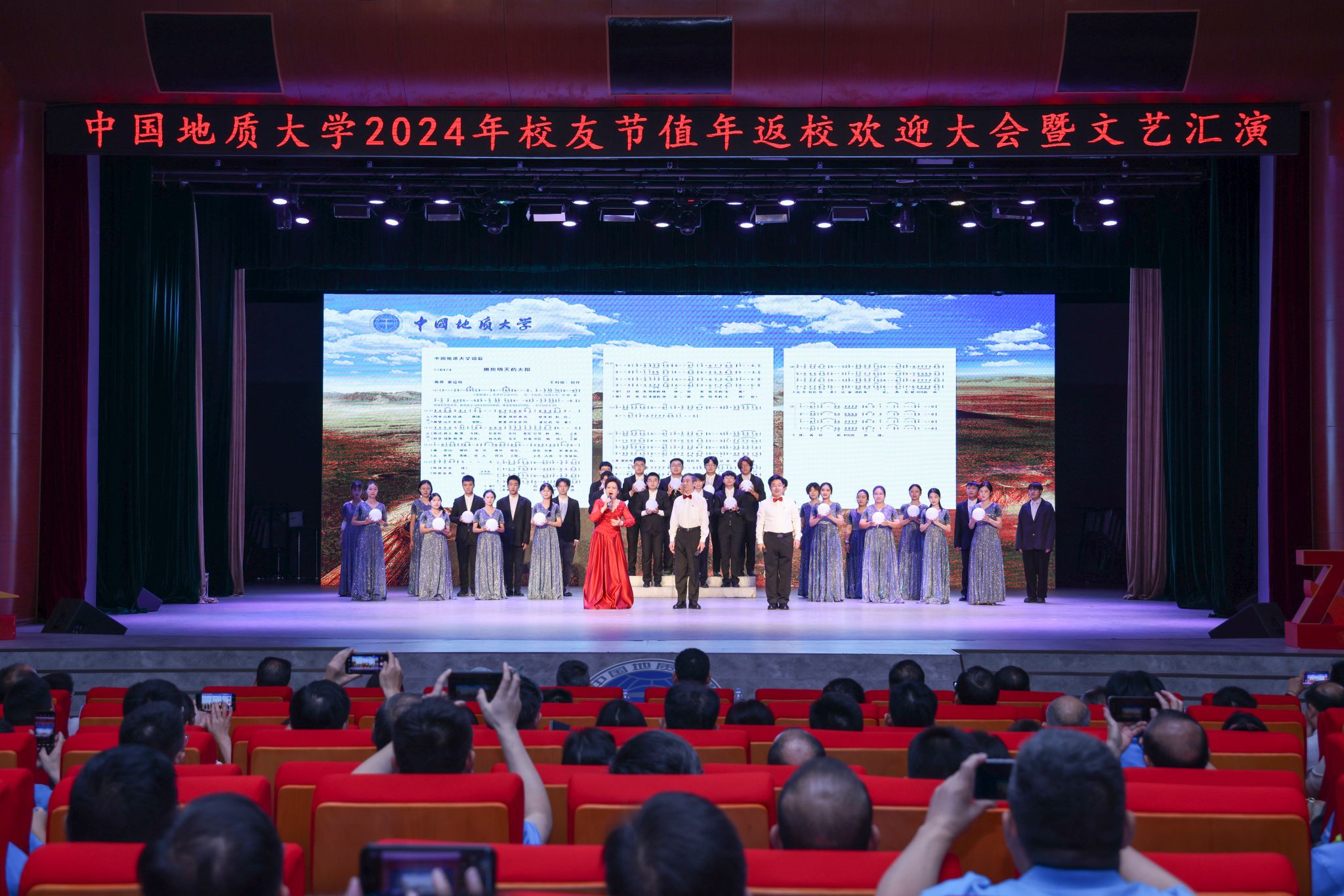 全体人员在艺术与传媒学院余磊老师指挥下齐唱校歌《勘探队员之歌》。