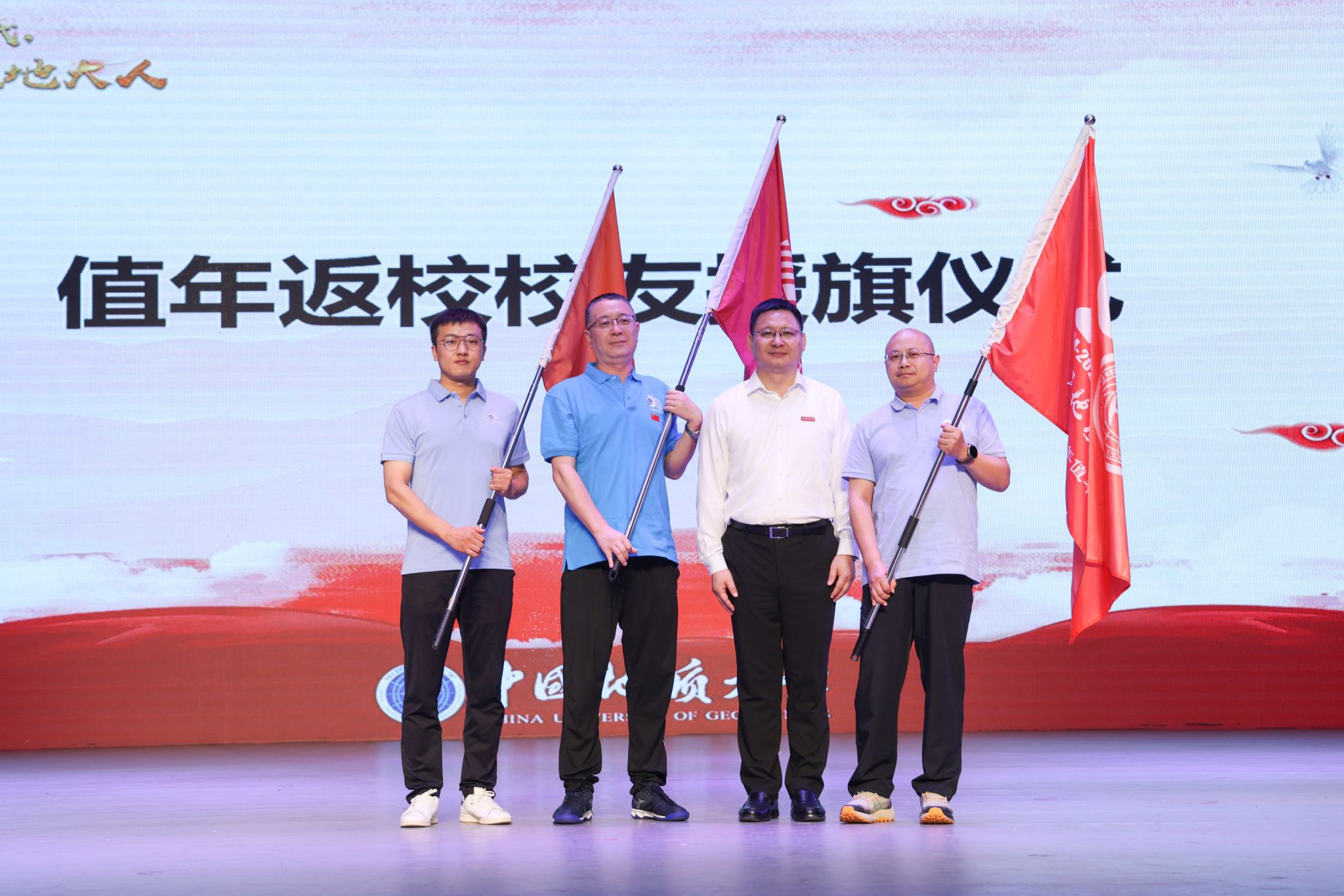 刘杰为1994届李长胜校友、2004届陈永涛校友、2014届孙峰校友授旗。