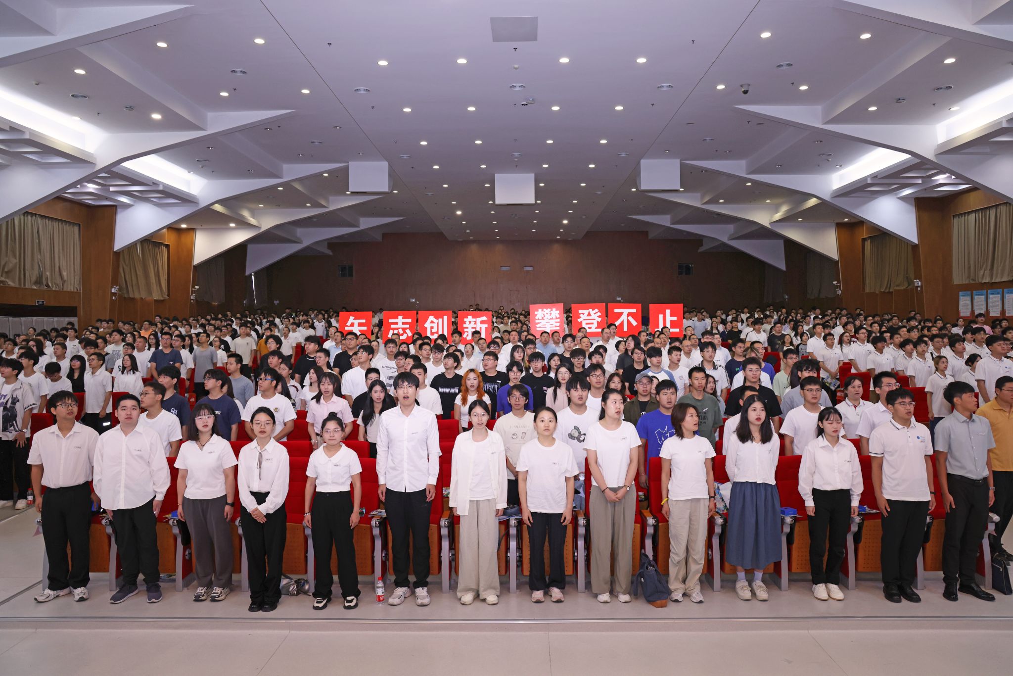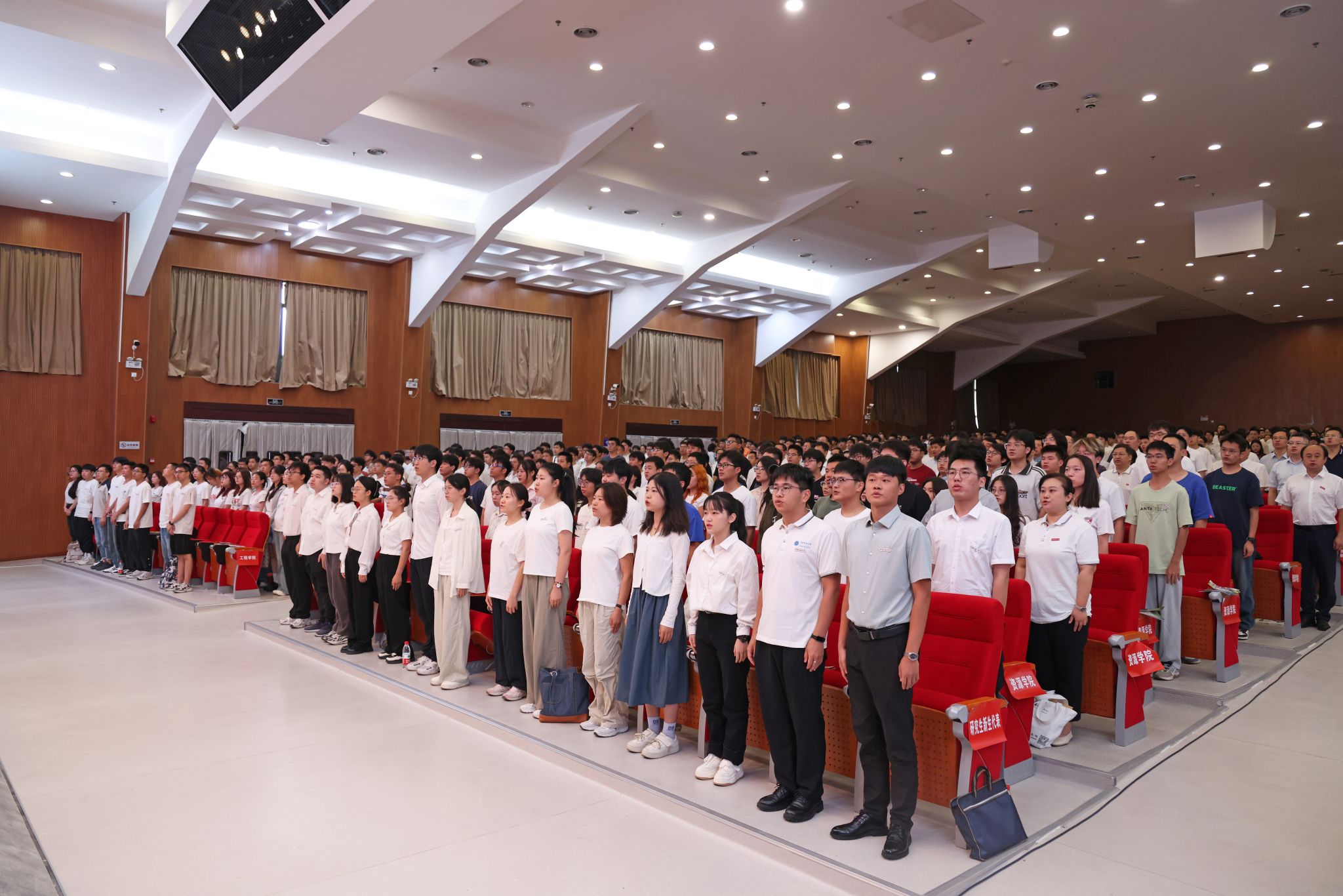典礼开始,全体起立,师生齐唱国歌。