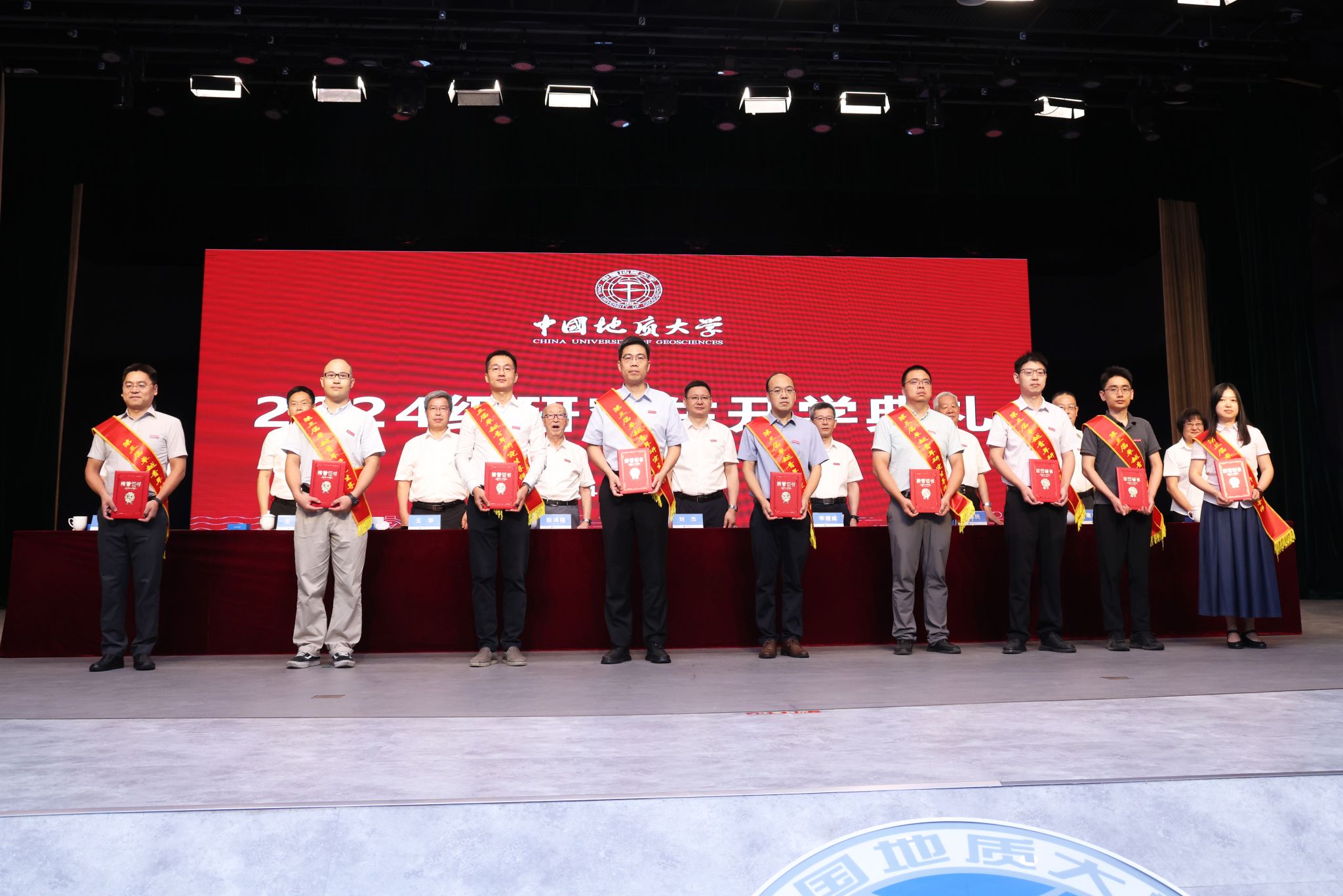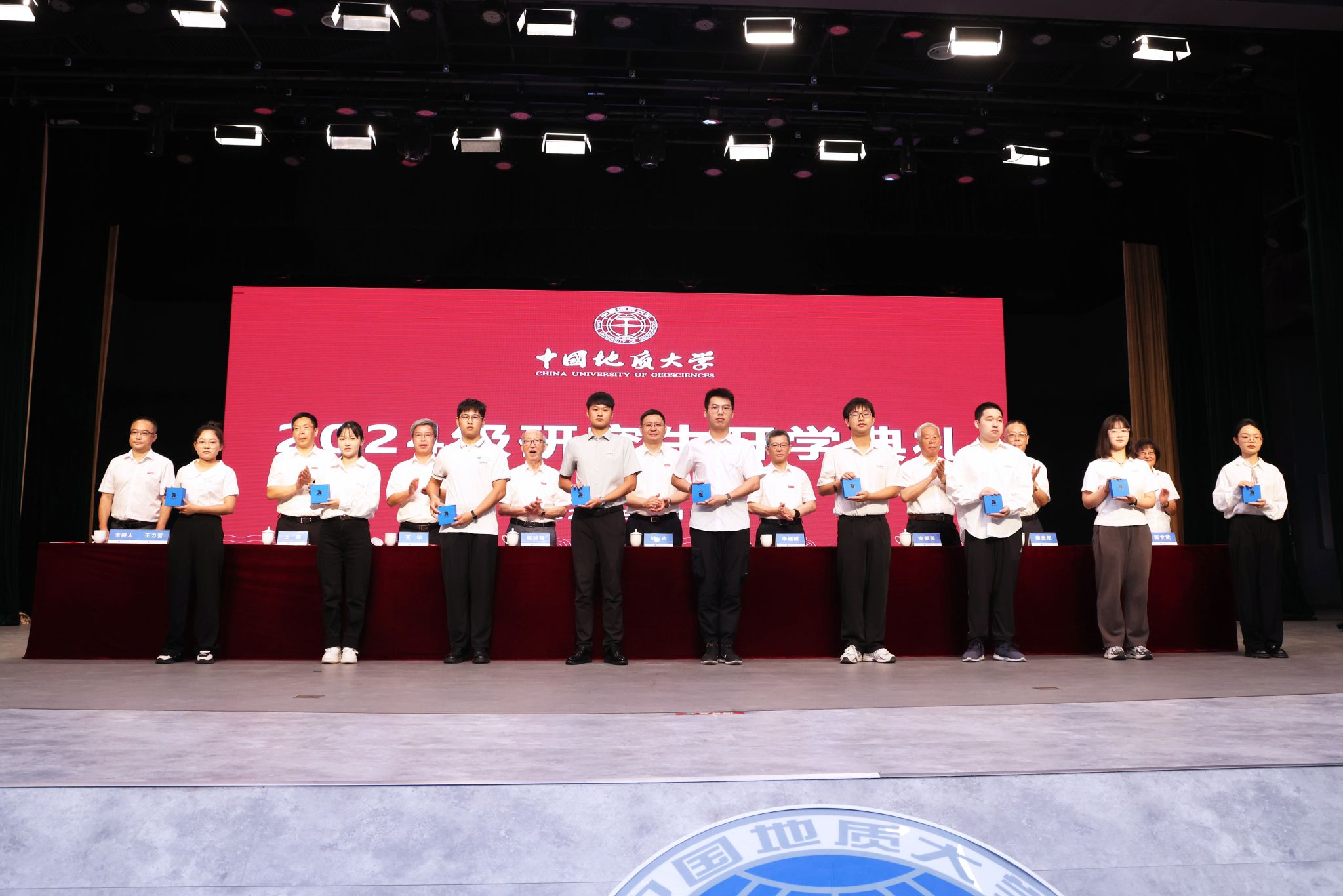 与会校领导、院士为2024级研究生新生代表赠送校徽校标。
