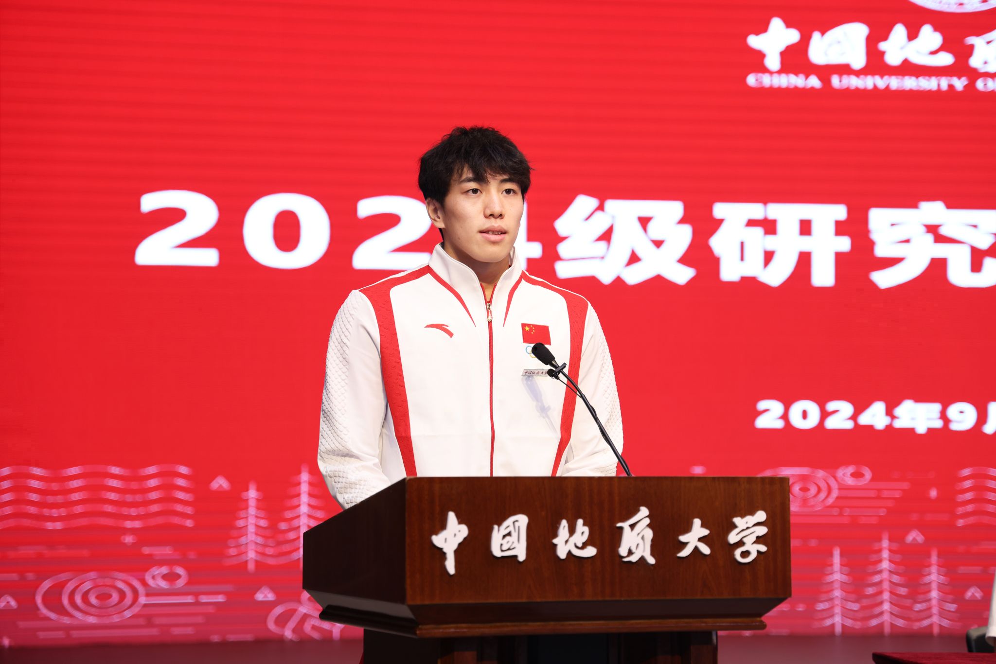 在校生代表、2024年巴黎奥运会男子4*100米混合泳接力冠军、体育学院体育学专业硕士研究生孙佳俊同学发言。他用“厚积薄发”“临危受命”和“心怀感恩”三个关键词与大家分享了他的夺冠故事,新生们备受鼓舞。他号召同学们以饱满的热情和坚定的意志,共同在求知的道路上探索,逐梦前行,登上属于每个人自己的“奥运之巅”。