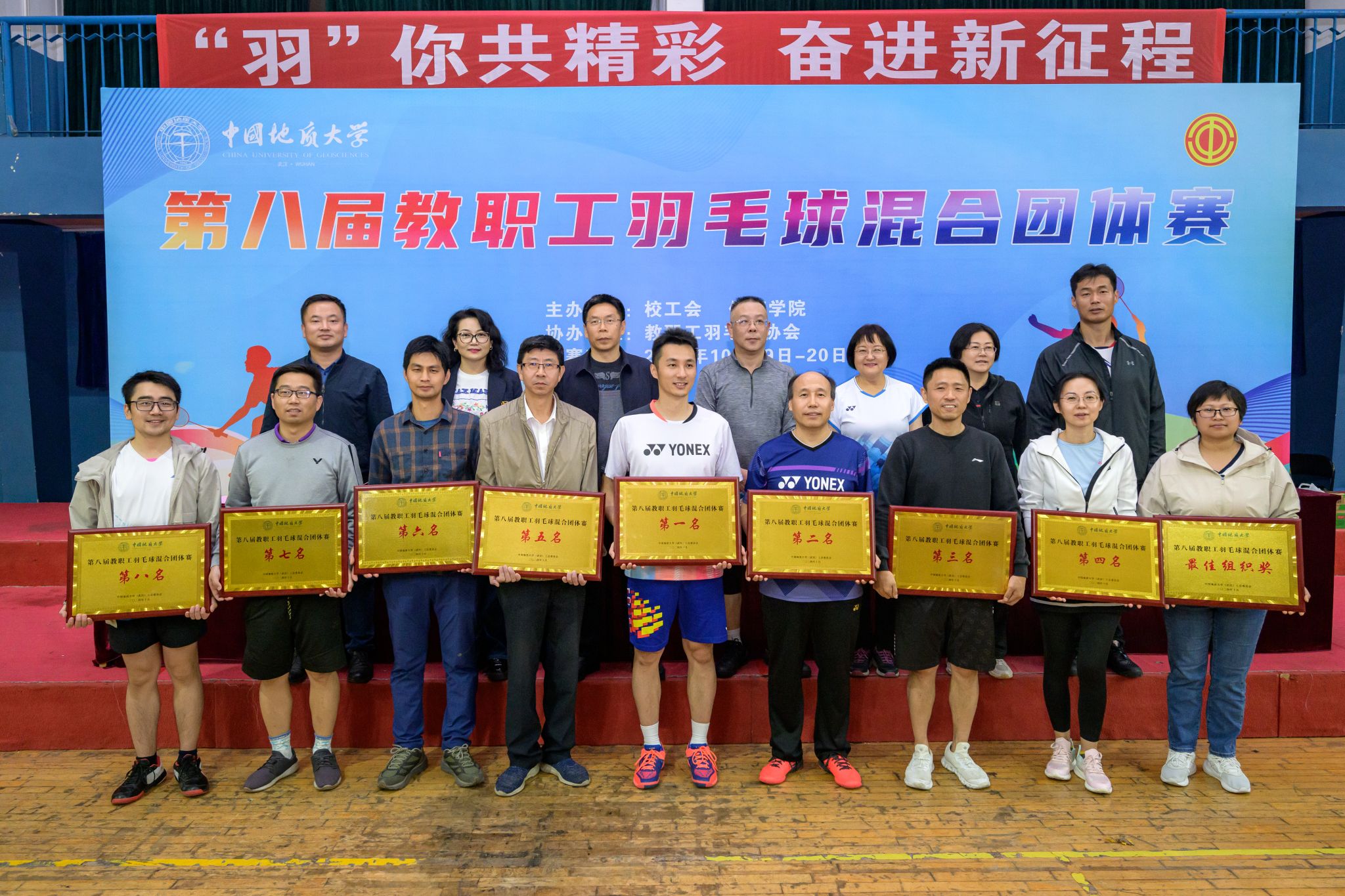 经过两天激烈角逐,体育学院分工会获得冠军,图书档案与文博部分工会获得亚军,机关分工会、经济管理学院分工会、外国语学院分工会、地球科学学院分工会、资源学院分工会、自动化学院分工会分别获得第三名至第八名,医院分工会获得最佳组织奖。唐忠阳、王甫、陈文武、体育学院党委书记庞岚及校工会常务副主席郭秀蓉参加闭幕式并为获奖分工会颁奖。