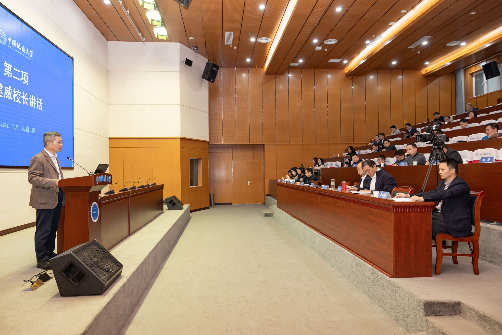 李建威讲话。他指出,地质e站是学校贯彻落实党的二十届三中全会和全国教育大会精神,在建设中国式现代化的时代大背景中,落实立德树人根本任务,赓续学校实践育人的优良传统,高质量服务地质行业和自然资源行业的重大战略举措,是探索科产教融合高水平育人、培养地质领域拔尖创新人才的创新举措,也是学校对接国家重大战略,服务新一轮找矿突破战略行动的重要抓手。各单位要准确把握建设地质e站的背景意义和内涵实质,贯彻落实学校“五通融合”立德树人体系,深化人才培养理念和模式改革,统筹汇聚各方育人资源,重构育人链条,重塑评价体系,以地质e站为依托扎实推进拔尖创新人才培养。