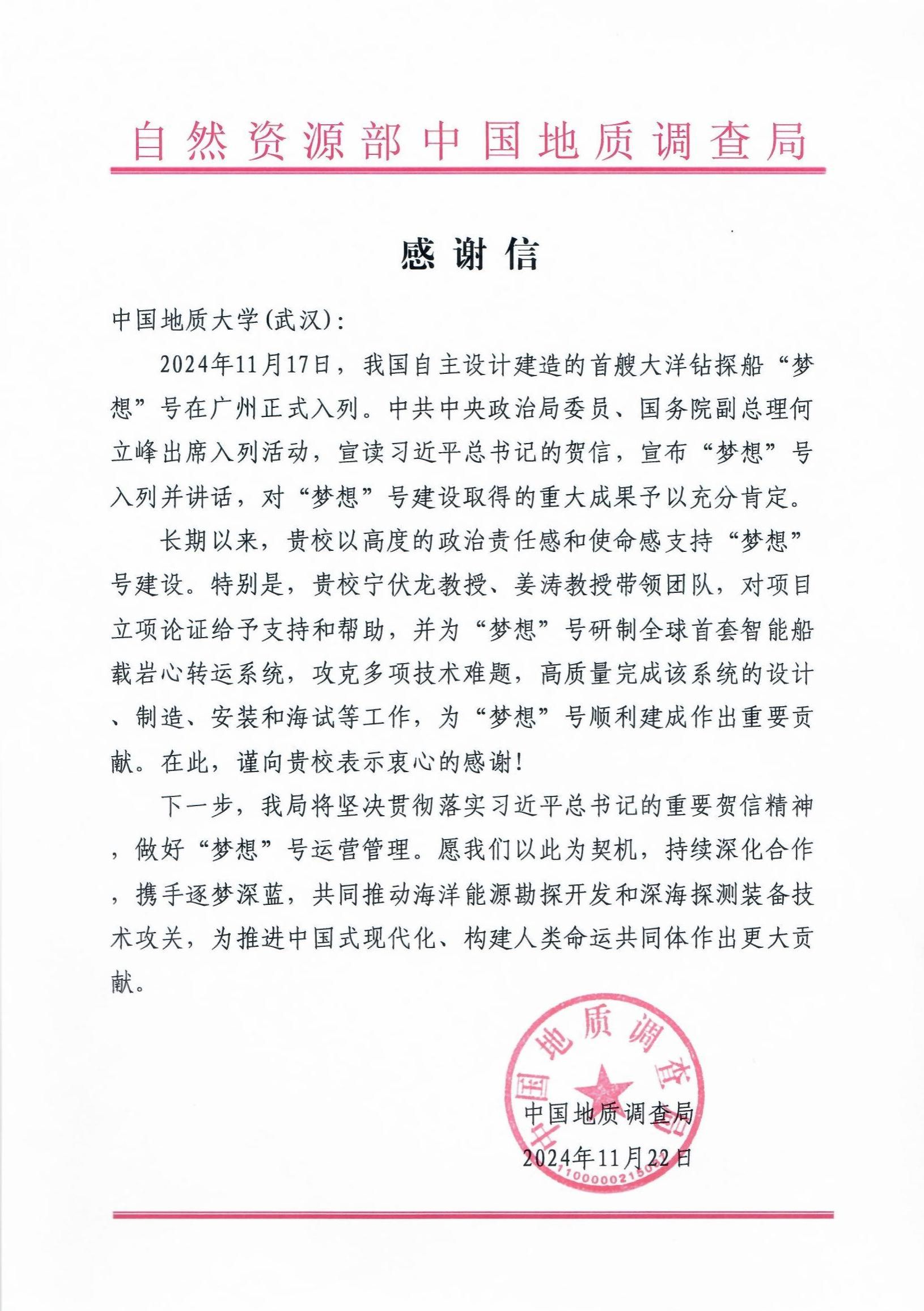 “梦想”号海试成功并正式入列,自然资源部中国地质调查局向opta足球发来感谢信,对学校以高度的政治责任感和使命感支持“梦想”号建设表示感谢。