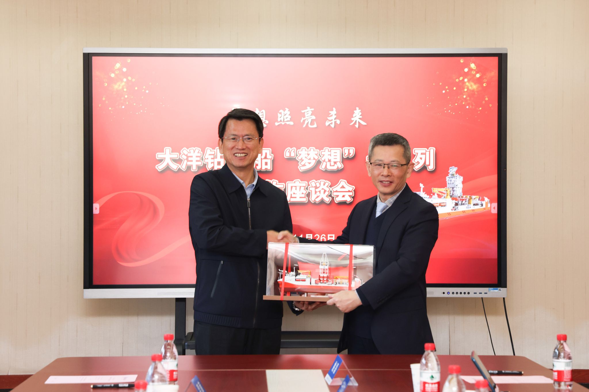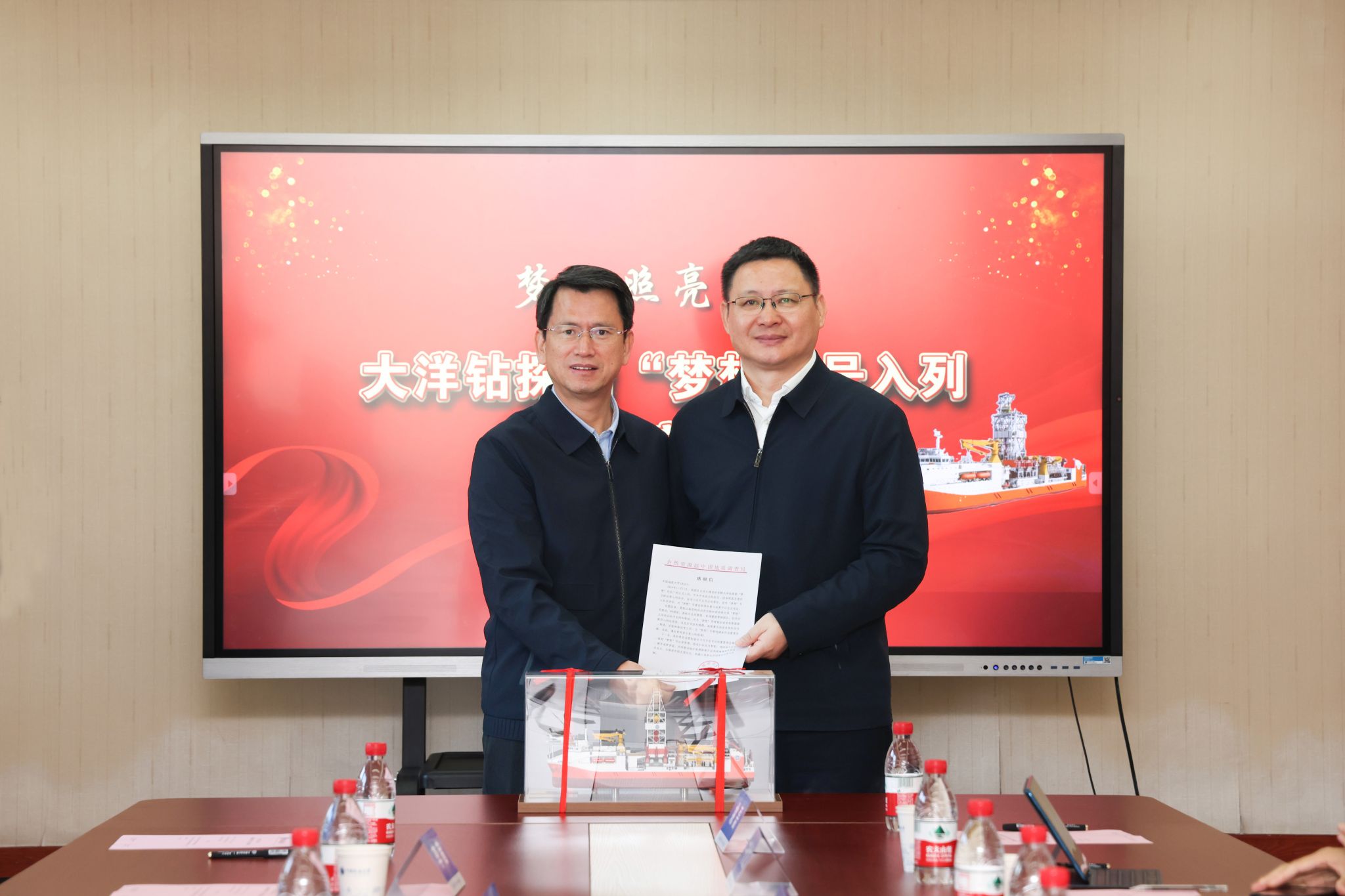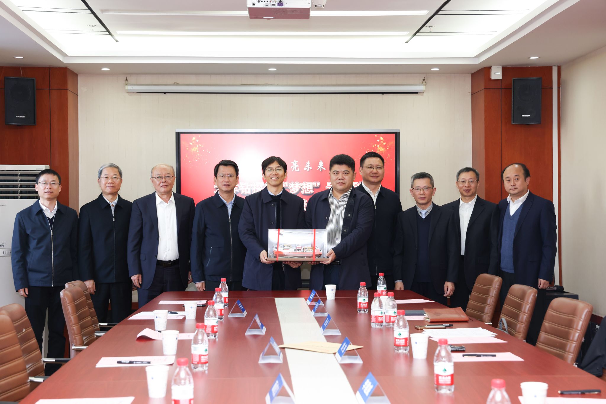 11月26日,中国地质调查局党组成员、副局长颜成义代表中国地质调查局向学校转交感谢信,并向学校赠送“梦想号”大洋钻探船船模。