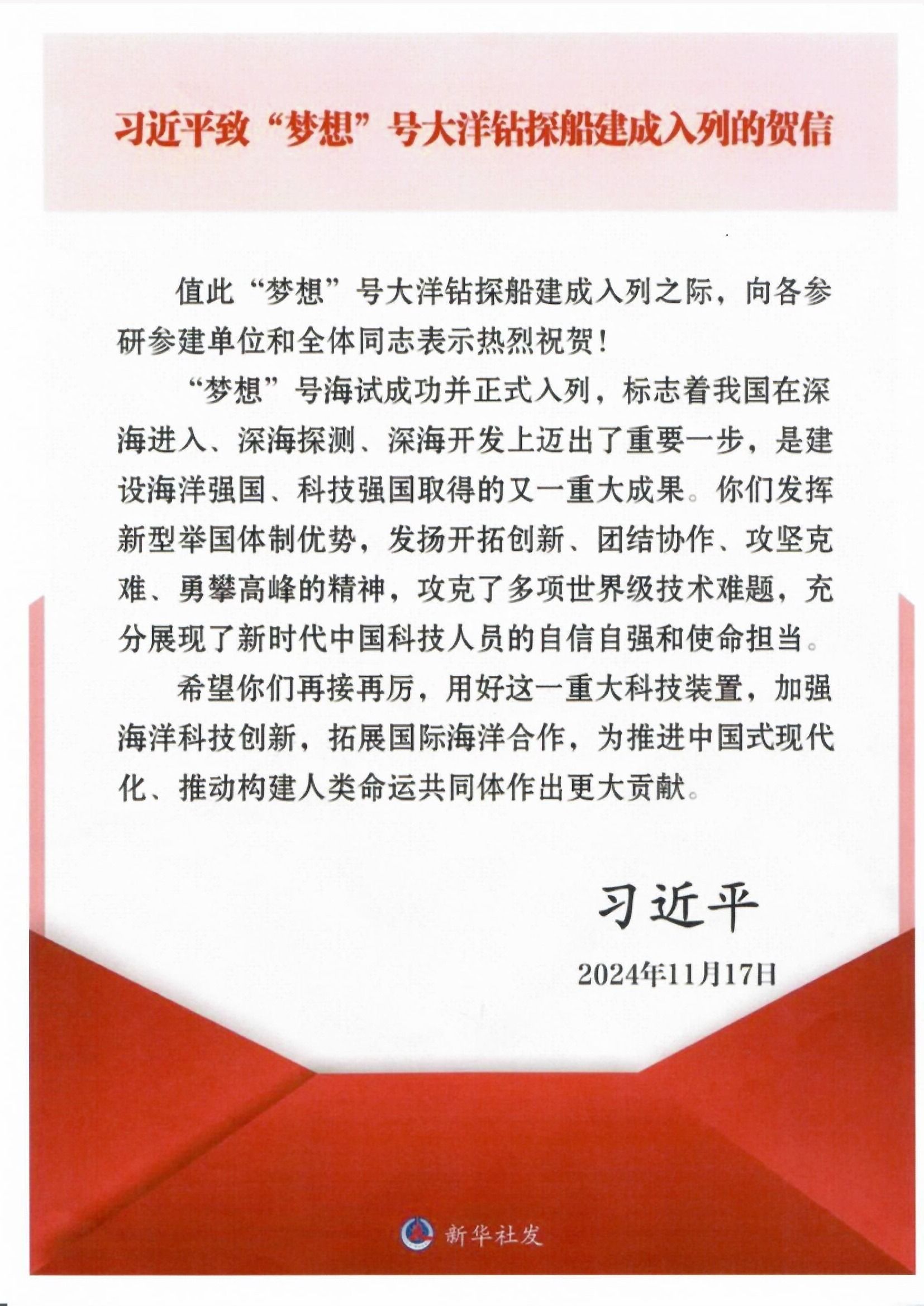 11月17日,我国自主设计建造的首艘大洋钻探船“梦想”号在广东广州正式入列,标志着我国深海探测关键技术装备取得重大突破。中共中央总书记、国家主席、中央军委主席习近平发来贺信,表示热烈祝贺。习近平总书记在贺信中指出,“梦想”号海试成功并正式入列,标志着我国在深海进入、深海探测、深海开发上迈出了重要一步,是建设海洋强国、科技强国取得的又一重大成果。