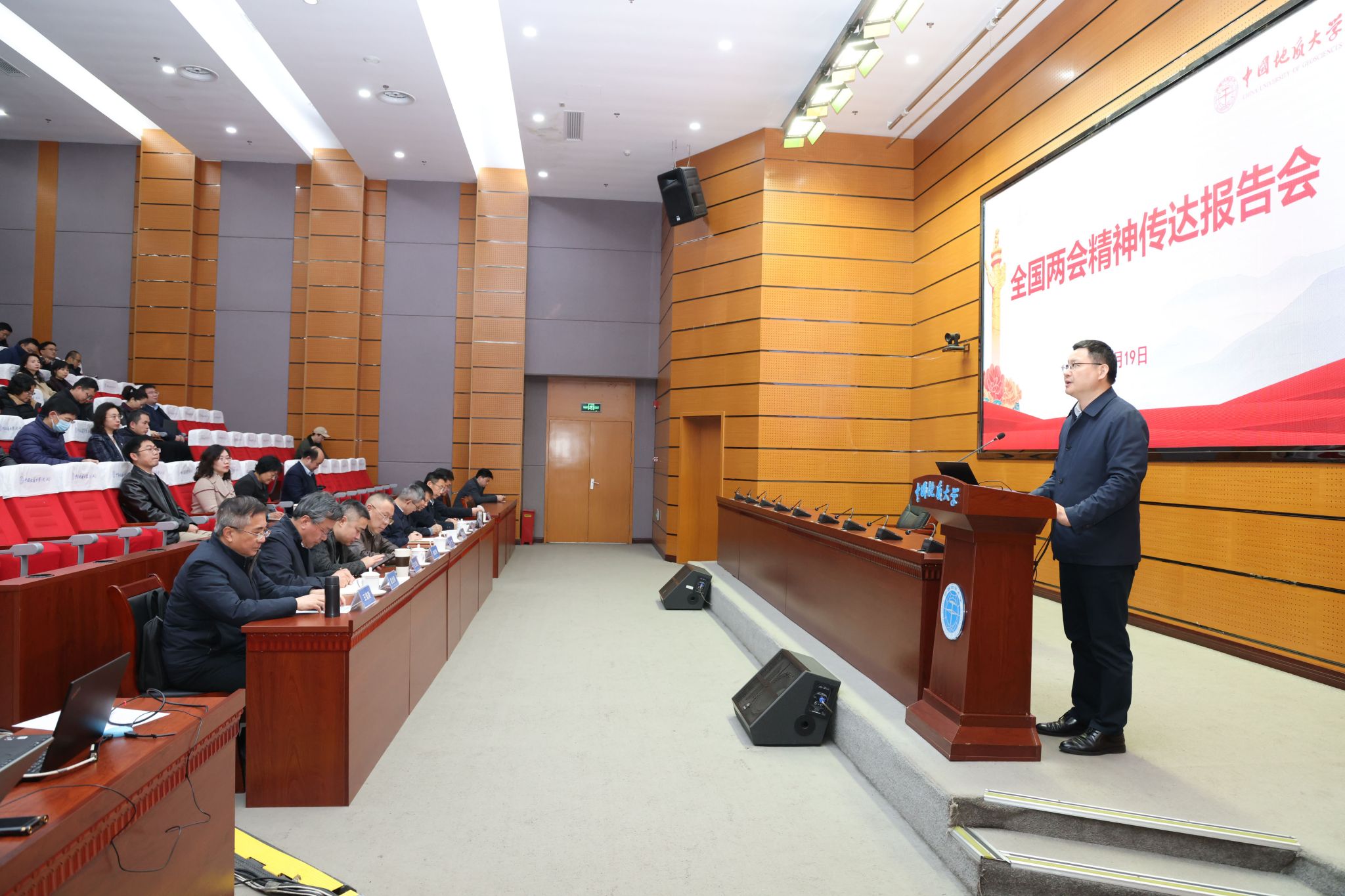 全国人大代表、中国科学院院士王焰新教授,全国政协委员童金南教授结合个人参会感受和履职情况,介绍了2025年全国两会的基本概况,深入解读政府工作报告、“两高”报告、湖北代表团和环境资源界别委员协商议政情况。两位代表委员聚焦科技创新与产业融合、新质生产力培育、生态文明建设、长江经济带高质量发展、乡村振兴、拔尖创新人才培养、“双一流”大学的担当作为等方面分享了感想体会,并对学校高质量发展提出意见建议。