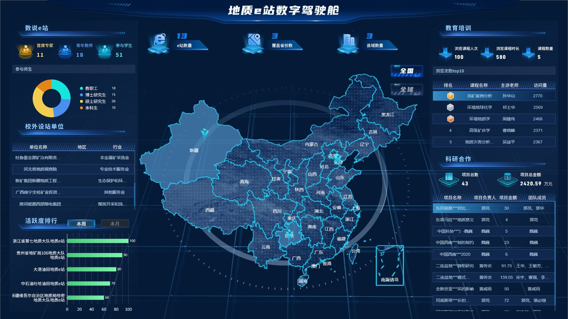 “地质e站数字驾驶舱是地质e站管理系统的中控大脑,通过数字驾驶舱,学校地质e站师生团队可一键触达远在万里之外的e站共建单位,通过面对面连线,双方交流沟通在研项目的具体进展,e站共建单位也可随时随地发起频视会议,将生产一线的‘疑难杂症’与校内师生共同‘把脉问诊开方’。”在地质e站数字展厅现场推进会上,项目负责人吴仁喜向校内师生团队介绍e站管理系统。