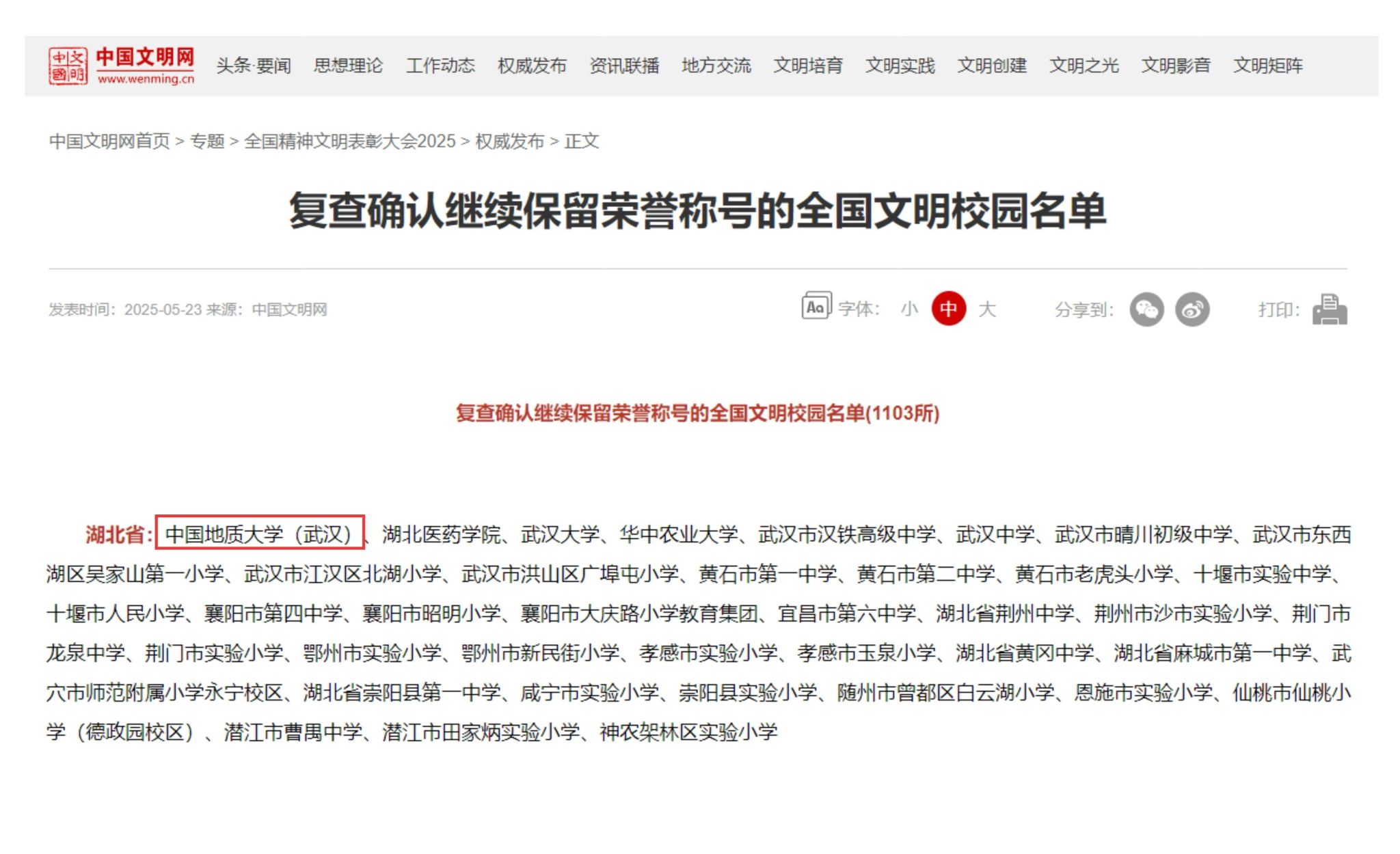 站在新的起点,学校将始终坚持以习近平新时代中国特色社会主义思想为指导,全面贯彻落实党的二十大和二十届二中、三中全会精神,深入学习贯彻习近平文化思想,学习贯彻习近平总书记关于精神文明建设的重要论述,强化社会主义核心价值观引领作用,持续深化精神文明创建成果,努力为加快建设地球科学领域世界一流大学提供坚强思想保证、强大精神力量和有利文化条件。(编辑 焦思勤 审稿 尚东光)