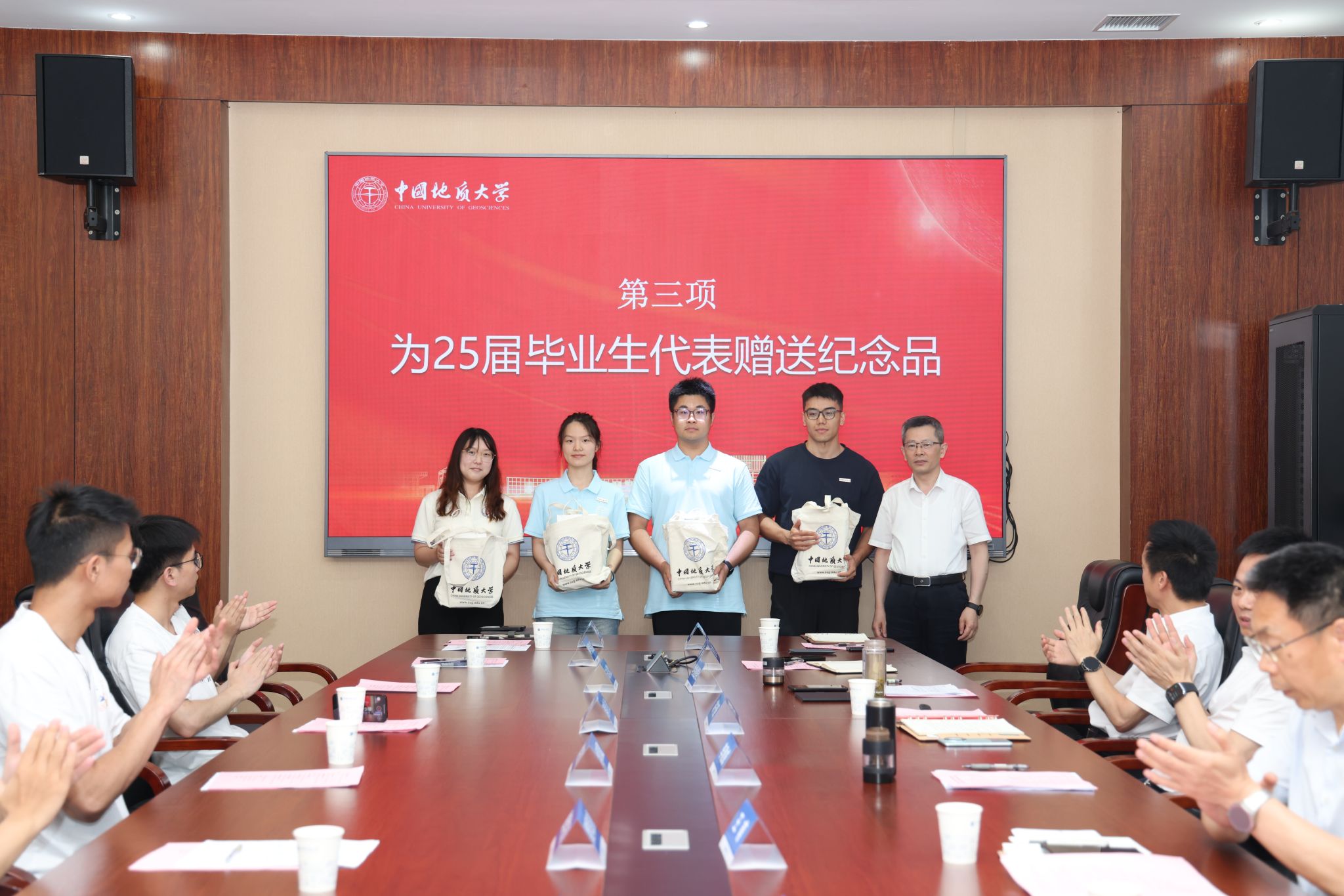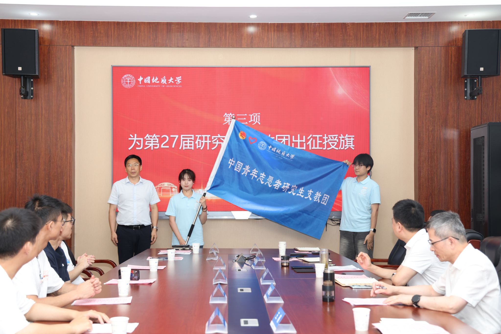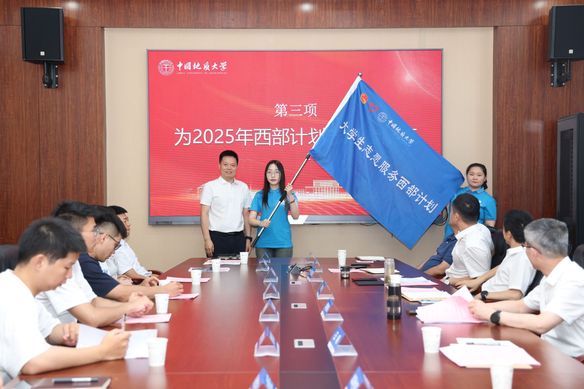 出征仪式上,胡守庚为2025年西部计划志愿者授旗;王甫为第27届研究生支教团授旗;李建威为参加座谈会的毕业生代表赠送了校园文创纪念品。