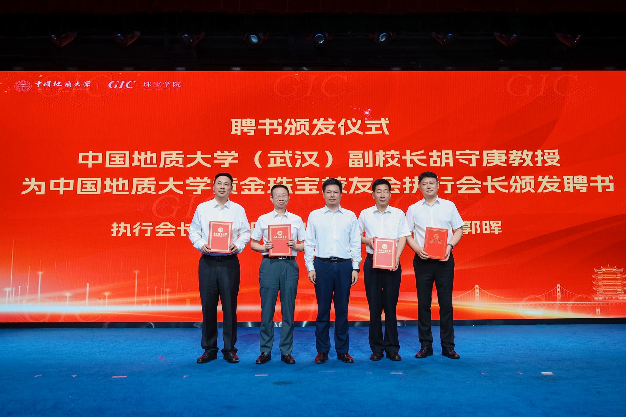 胡守庚为黄金珠宝校友会会长周宗文,执行会长王振、史洪岳、何小林、郭晖颁发聘书。
