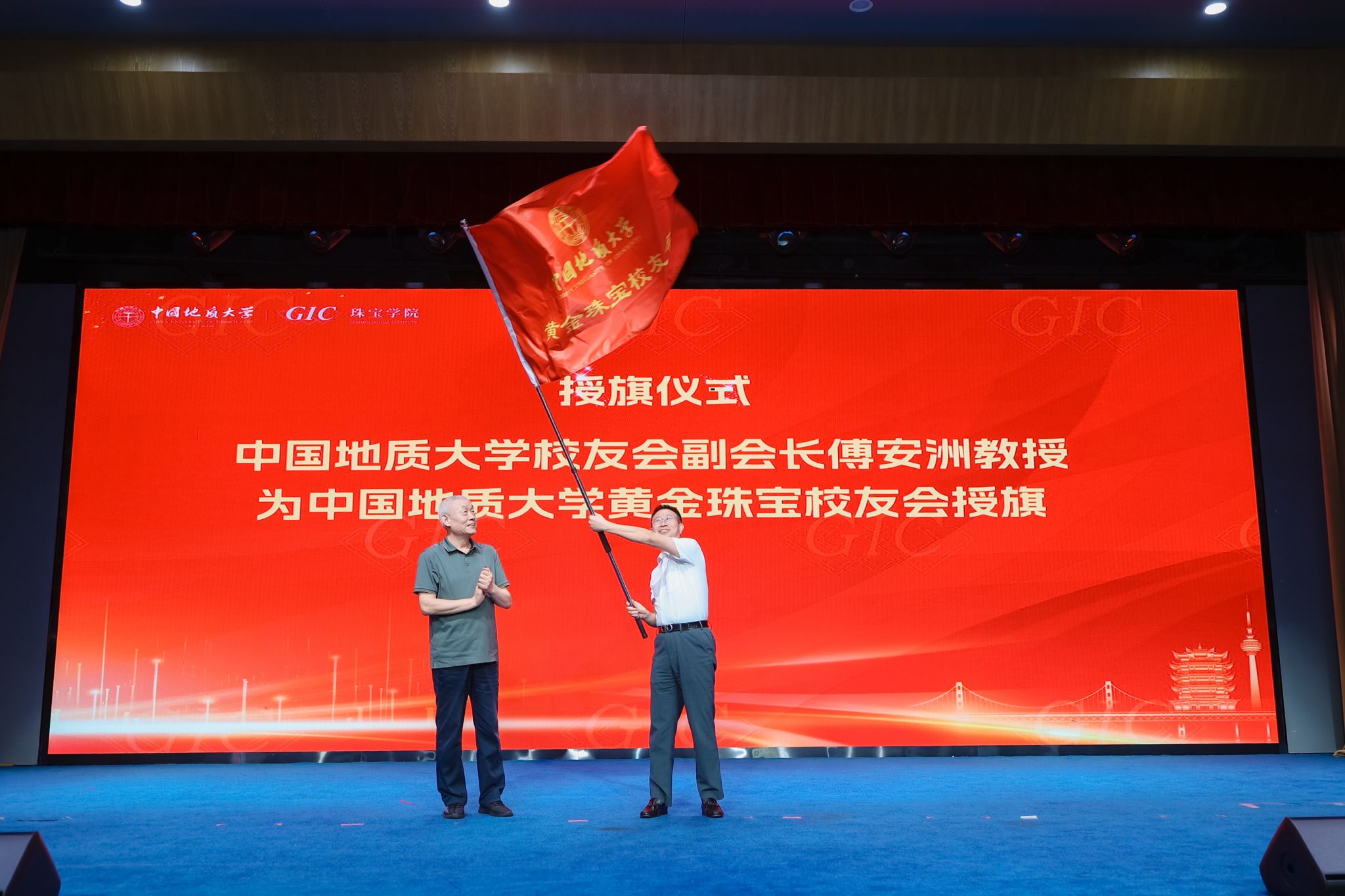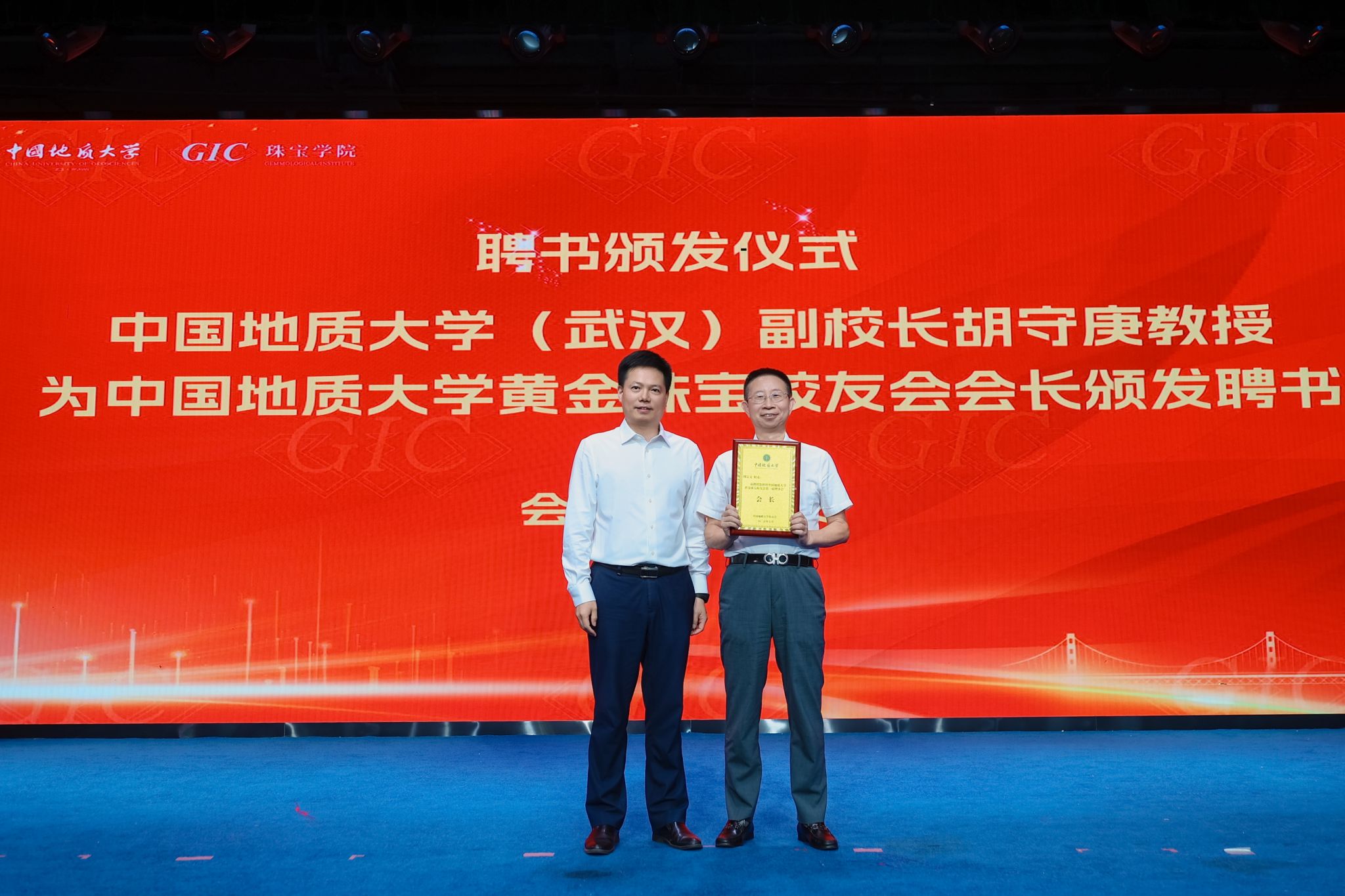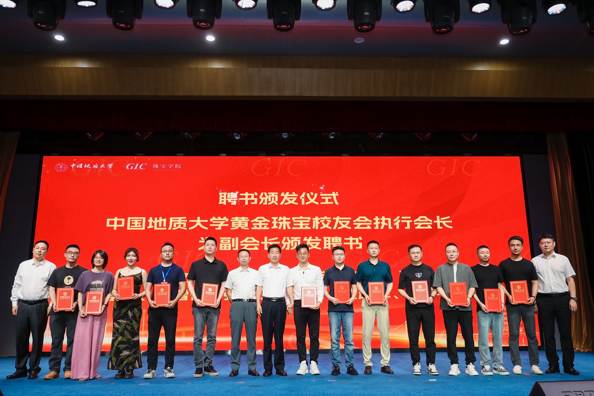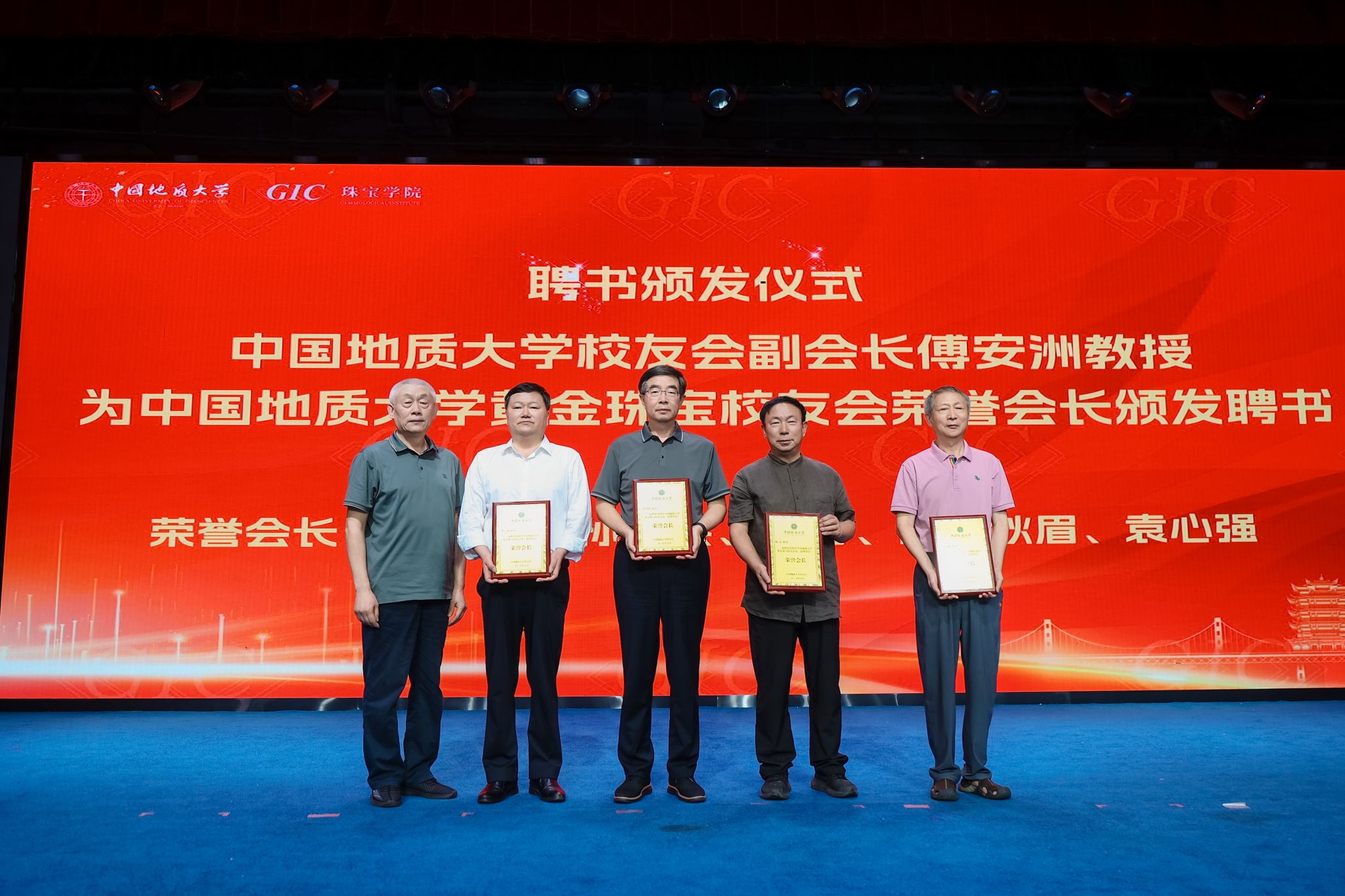 珠宝学院党委书记薛保山、院长尹作为向黄金珠宝校友会理事颁发聘书。