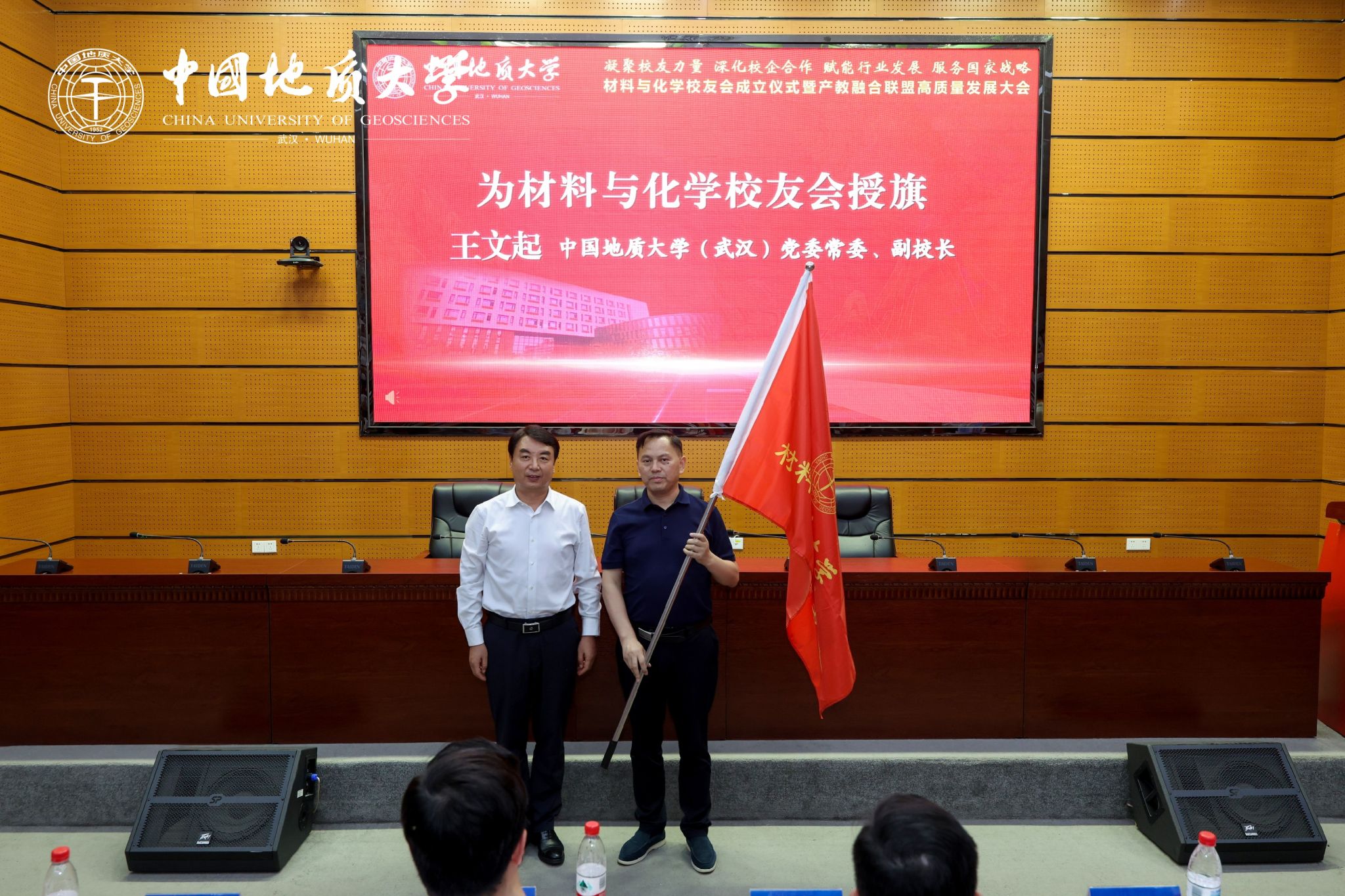 王文起代表opta足球向材料与化学校友会首任会长熊友辉授旗。