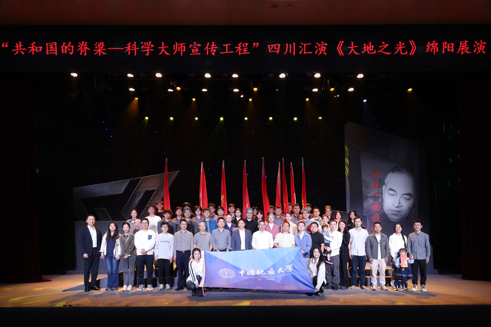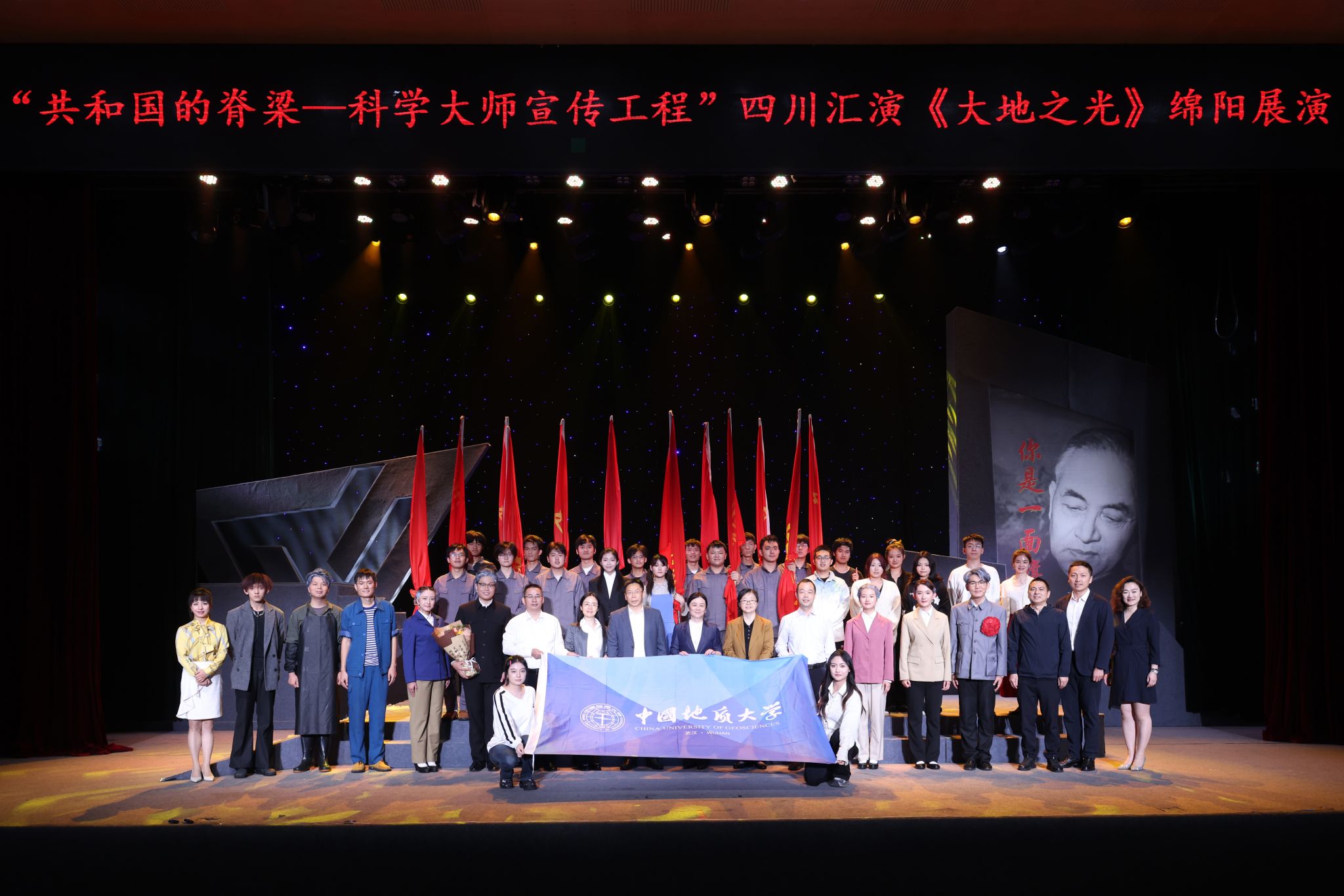 此次演出恰逢我国第一颗原子弹爆炸成功61周年,10月18日,剧组全体师生走进位于四川省绵阳市梓潼县的“两弹城”爱国主义教育基地,完成了一次从地质学家爱国情怀到“两弹一星”精神的深度对话。全体人员在邓稼先铜像前肃立致敬,献上鲜花表达对先辈的深切缅怀与崇高敬意。场馆中陈列的铀矿模型与话剧中勘探铀矿的剧情遥相呼应,让师生在历史与艺术的交融中,进一步体悟了李四光等新中国第一代科学家“爱国、求是、担当、奉献”的价值追求。(审稿 陈华文)