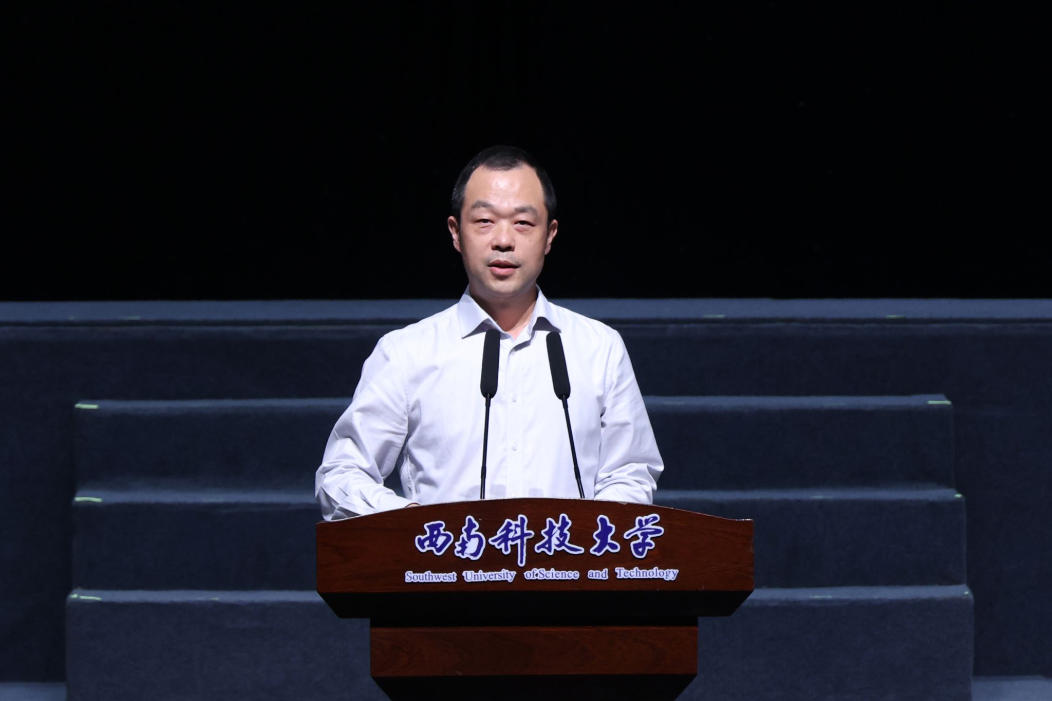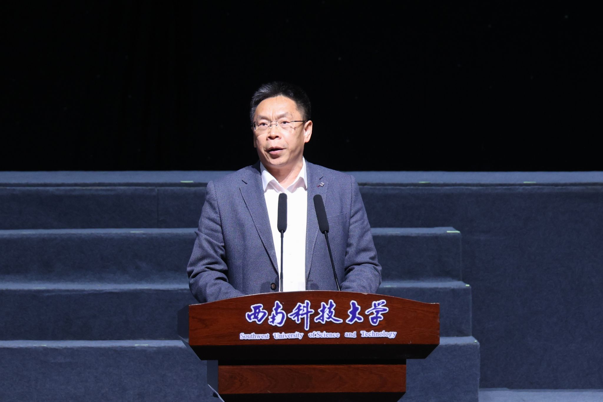 代波致欢迎辞。他表示,西南科技大学在地质学科方面底蕴深厚,是全国较早以非金属矿为特色开展人才培养的院校之一。话剧《大地之光》走进西南科大,不仅是一场浸润心灵的艺术盛宴,更是两校深化交流合作、共促学科发展的难得契机,将为进一步传承和弘扬科学家精神注入新动力,激发师生崇尚科学、探索未知、报效国家的热情。
