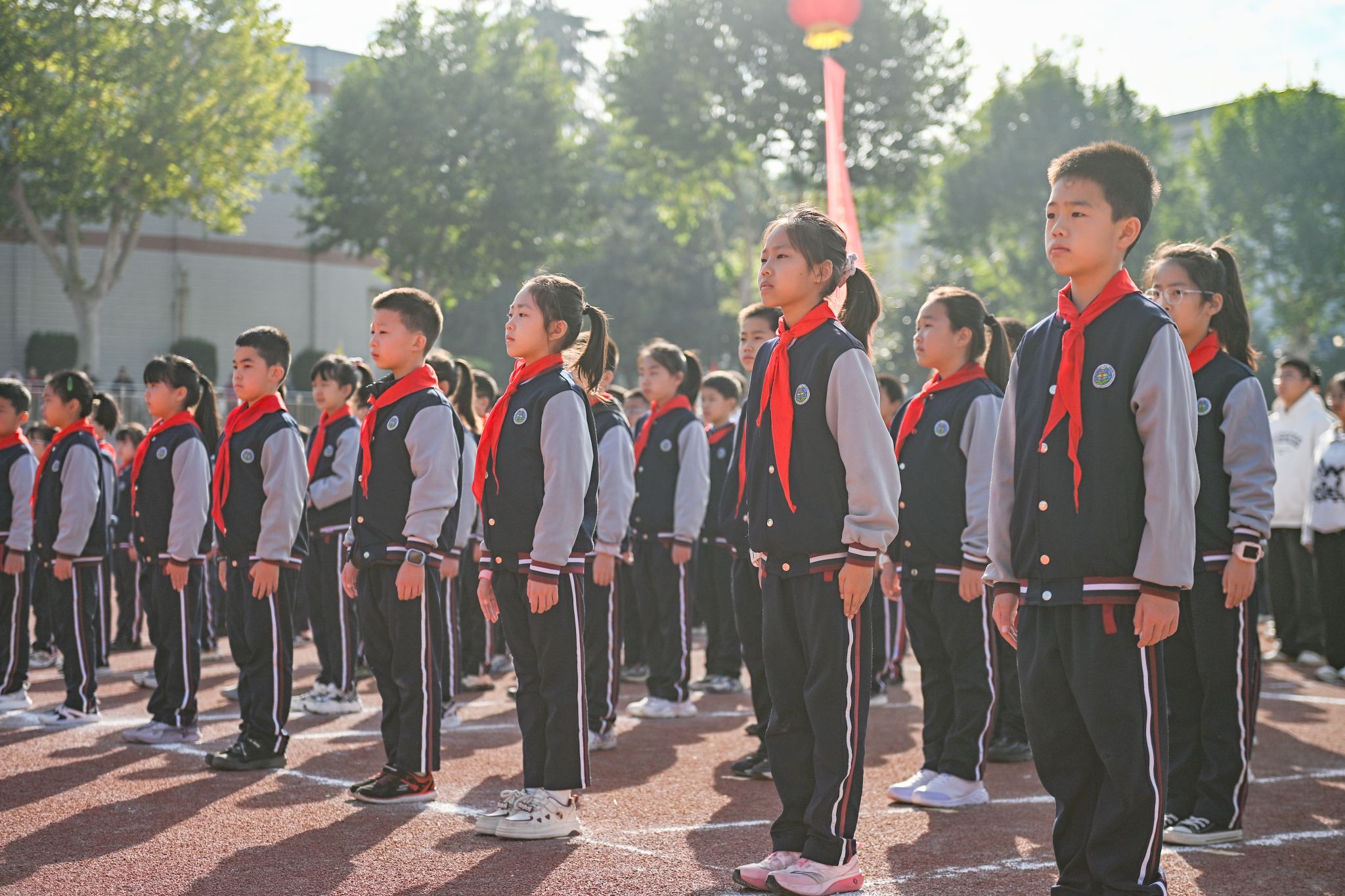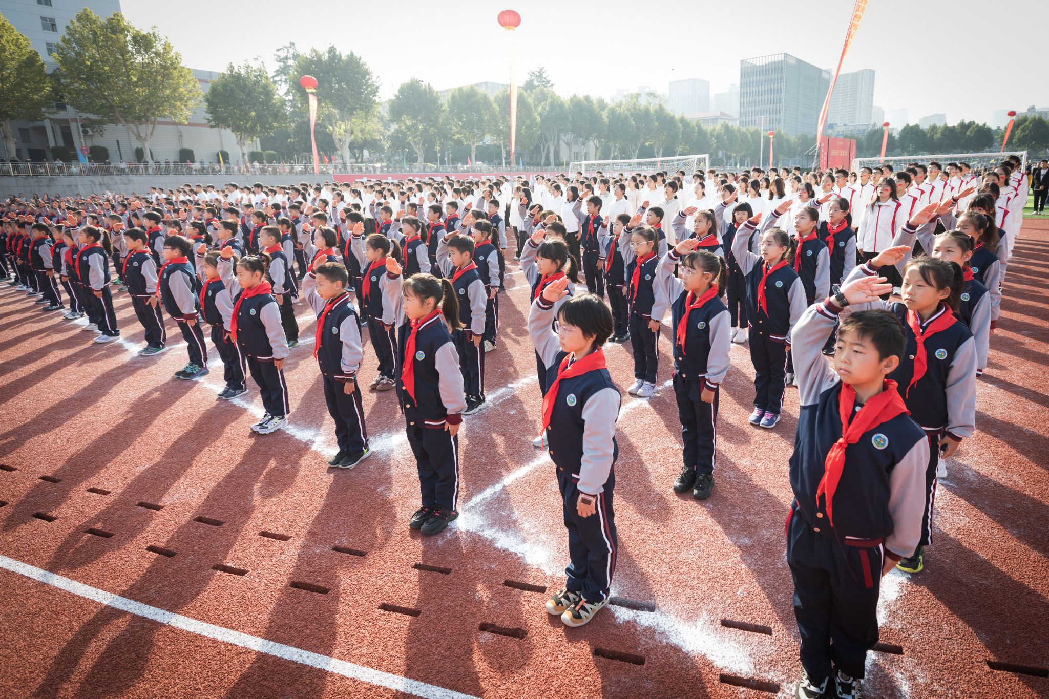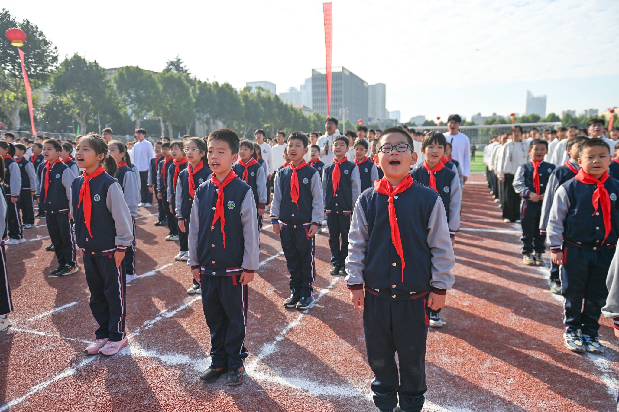 现场举行升国旗仪式,少先队员行队礼,全体师生肃立并行注目礼。