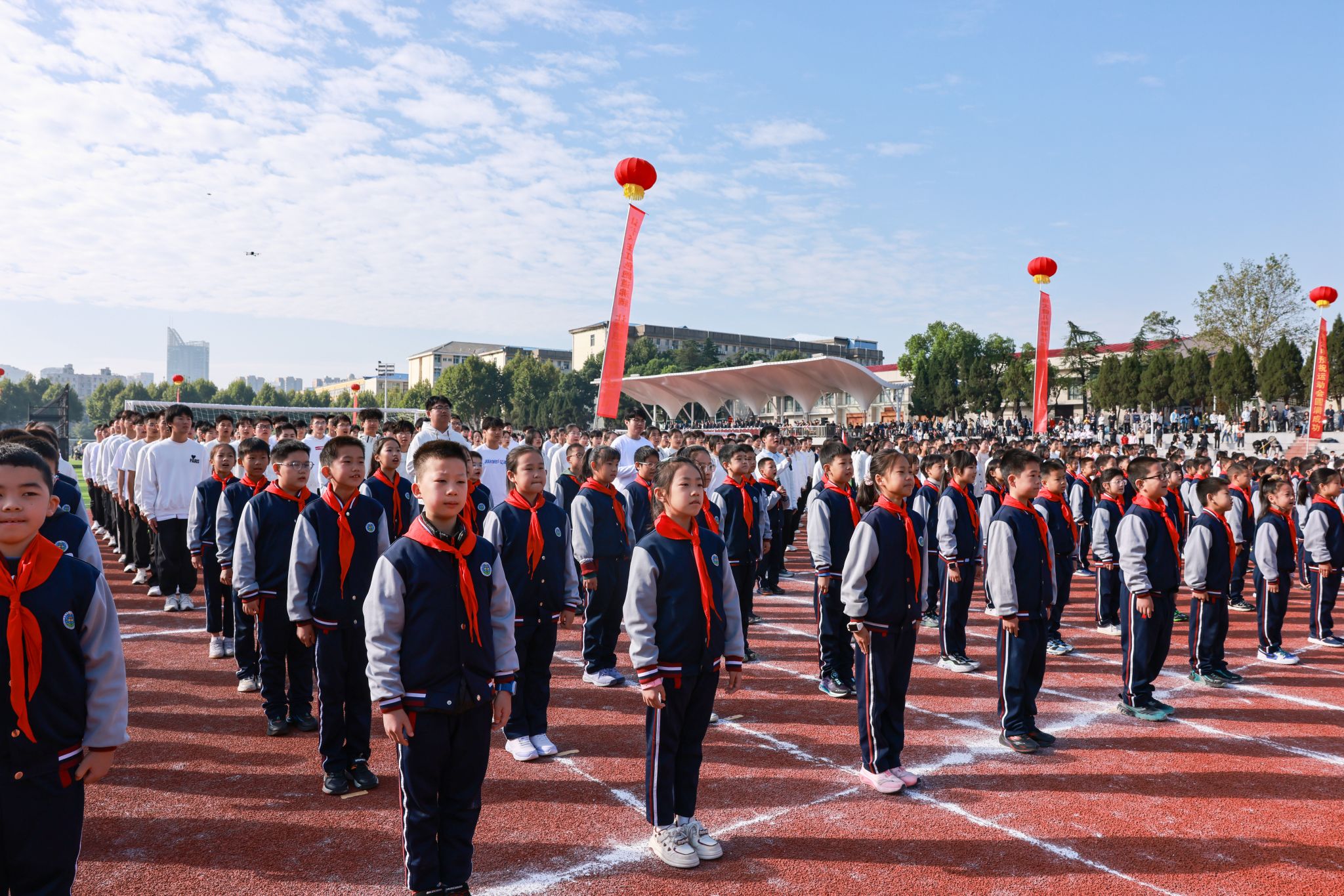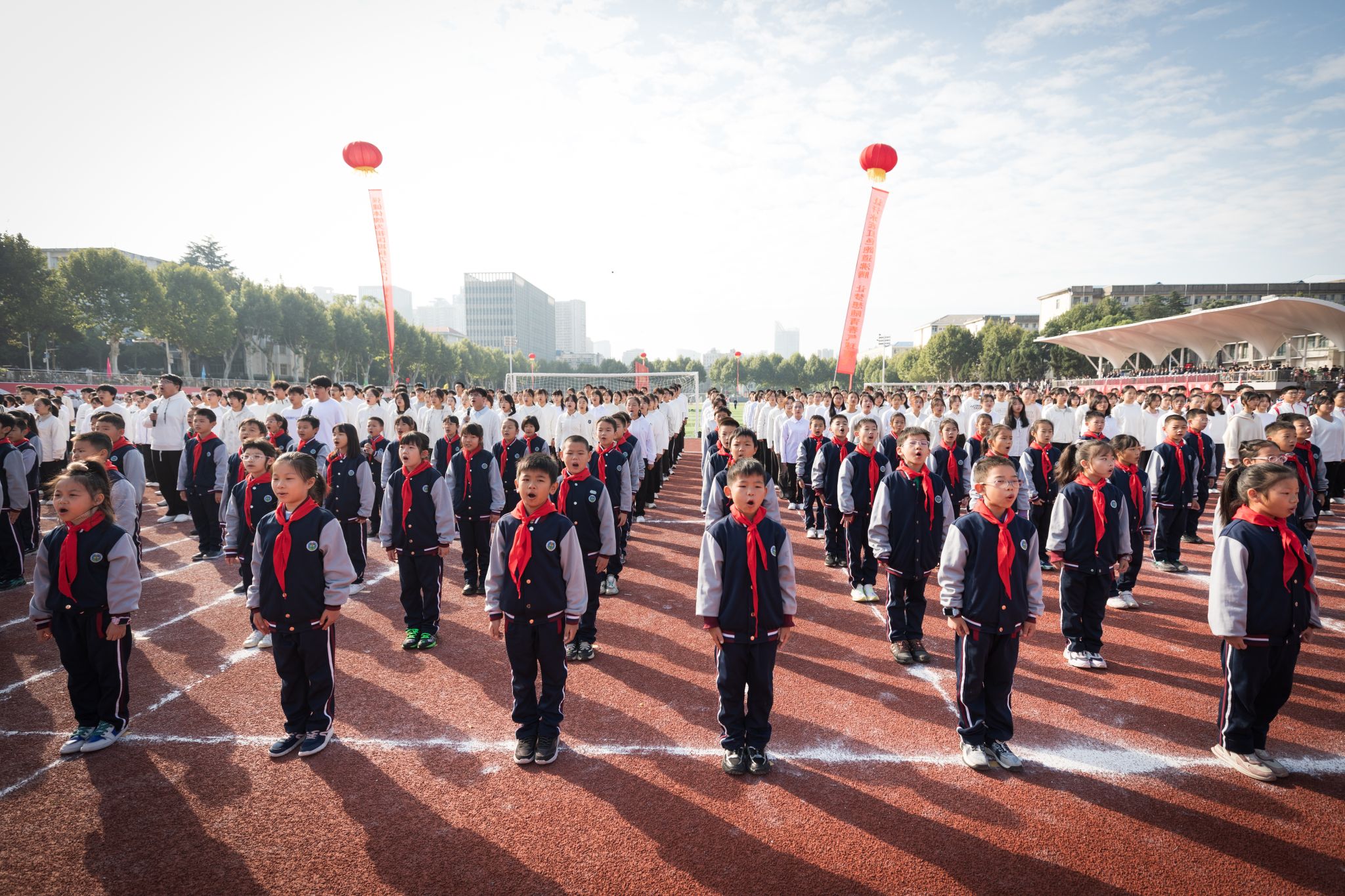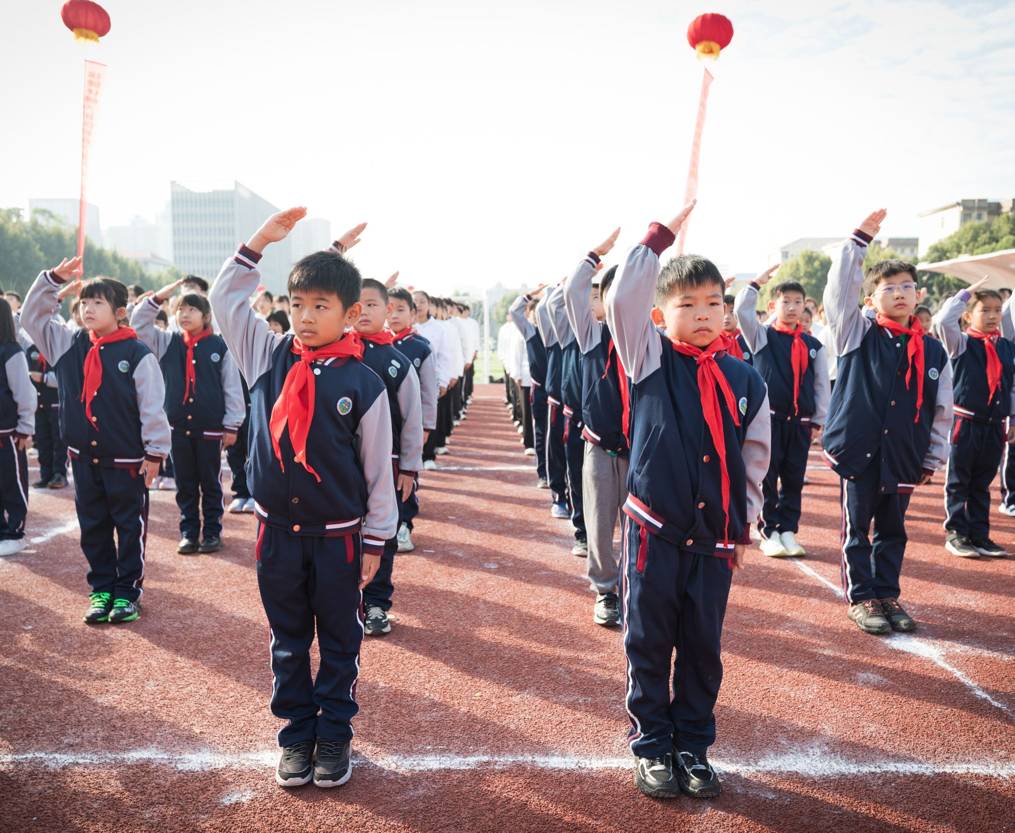现场举行升国旗仪式,少先队员行队礼,全体师生肃立并行注目礼。