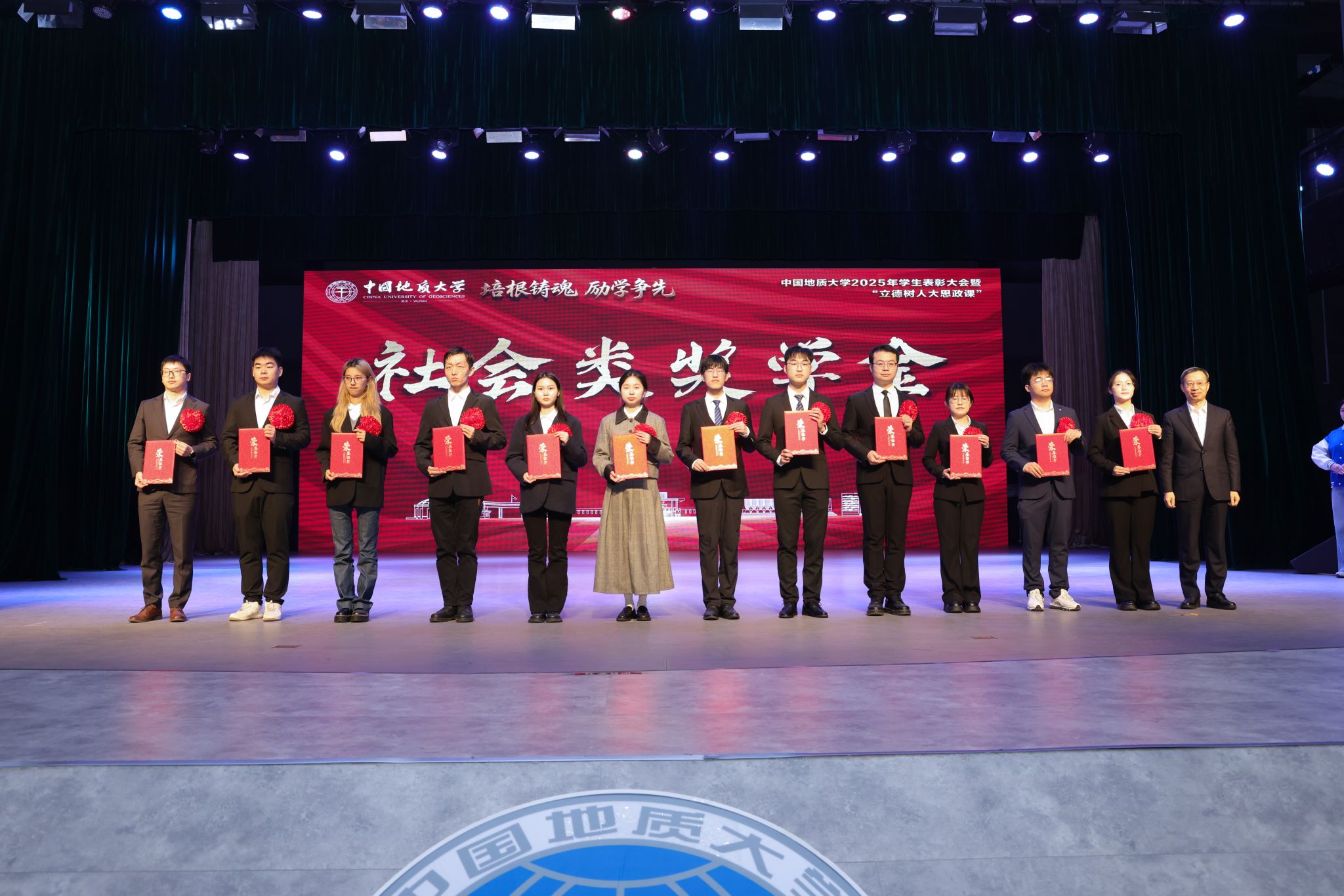李建威为李四光英才奖学金、冯景兰奖学金、杨遵仪奖学金、高山奖学金、赵鹏大奖学金、殷鸿福与金钉子奖学金获奖代表颁奖