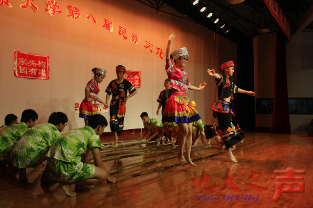 室内文艺汇演在大学生活动中心演播厅举行,维吾尔族同学带来的舞蹈《欢乐的维吾尔》,侗族同学带来的侗歌《蝉之歌》,哈萨克族同学带来的吉他弹唱《可爱的一朵玫瑰花》,土家族同学带来的摆手舞《土家印象》,黎族同学带来的竹竿舞《椰海风情》,壮族同学带来的山歌《心想唱歌就唱歌》等富有民族特色的精彩节目使现场气氛持续升温,观众席上喝彩连连,两个韵律十足的舞蹈,将现场气氛推至了高潮。
