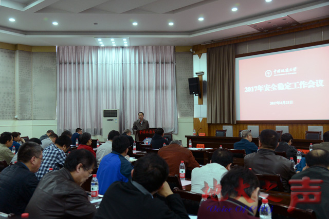 校党委书记何光彩讲话。就安全稳定工作,他提出三点意见:一是要强化政治担当,高度重视安全稳定工作。他强调,安全稳定工作涉及国家安全、学校稳定大局和每位师生切身利益,全体教职工要从讲政治、讲大局的高度,认清安全稳定形势,扎实做好安全稳定各项工作。二是要强化责任担当,扎实做好安全稳定重点工作。要牢牢把握意识形态领域工作的领导权、话语权,深刻领会习近平总书记关于意识形态工作的重要论述和精神要义,贯彻落实教育部党组和湖北省委的部署要求,站稳守好学校意识形态工作的前沿阵地。要严格规范做好保密工作,认真落实保密工作领导责任制,防微杜渐消除安全隐患。三是要严明政治纪律,落实安全稳定工作责任制。各二级单位党政主要负责人要把安全稳定工作放在心上、扛在肩上、抓在手里,强化教育管理,强化制度、财力、物力和人力保障,强化责任追究,做到有责必担、失责必究、问责必严。他强调,安全稳定重于泰山,丝毫放松、马虎不得,要以强烈的政治担当,以对学校事业高度负责的态度,以扎实务实的工作作风,共建平安和谐校园。