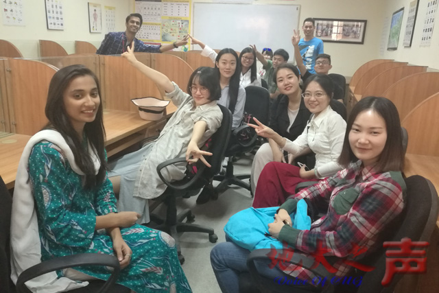 在学习交流版块,陈琪曼小组展示了在GC大学访学时的课程表,包括学习巴基斯坦文化、英语以及经济管理课程,以及任课教师、教室的照片等。我们看到,在任课教室墙面正中央,陈列着巴基斯坦和中国国旗。陈琪曼介绍说:“并不是因为我们到来才放上中国国旗,它一直都在那里” 在访学期间,授课老师还教授了简单的巴基斯坦当地语言——乌尔都语。