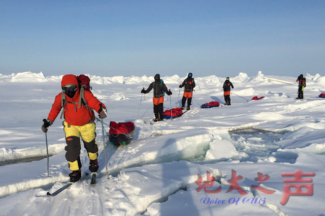 在北极,由于没有明显的参照物可作地标,队员们脚下的冰块一直在漂移,致使他们身陷危险。徒步出征的第五天早上,队员们起来后发现前一天看到的冰山间的突起消失了,取而代之的是一条裂缝。“这条裂缝离我们仅仅20米,如果算直线距离,连十米都不到,搭帐篷时若是离近一点,我们睡觉时肯定就掉到北冰洋里了。”何鹏飞说。