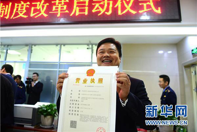 2015年10月8日,华创智库大数据科技有限公司法人代表姜镪领取吉林省首张“五证合一”营业执照。新华社记者 林宏摄