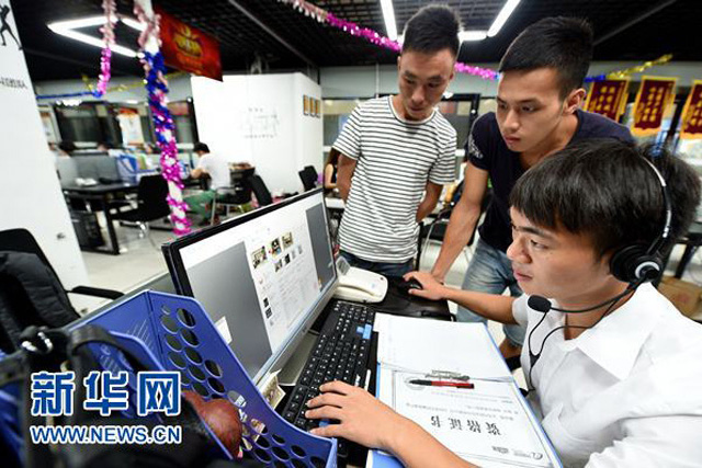 2015年7月19日,在浙江义乌国际商贸城网商服务区,“聚宝网商”的企业员工为新注册电商企业提供产品销售运行服务。2015年上半年,义乌市新增电商企业6869家,同比增长23%;电子商务实现交易额618亿元,同比增长31%。新华社发(龚献明摄)