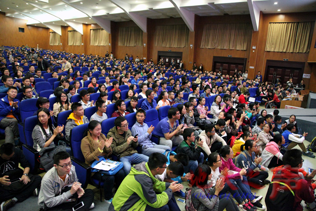 当天晚上,欧阳自远在弘毅堂作了“中国的探月梦”的报告。校党委副书记傅安洲,2000余名学生聆听了报告。他用通俗易懂、深入浅出的语言,从月球的起源说起,介绍了月球环境和人类对于月球的向往,详细地从月球的军事、能源、环境、资源四个角度介绍了世界各国尤其是美国的月球战略、科学成果、发展现状,说明了中国探月计划的重要性和紧迫性。随后,他介绍了中国探月工程从理论论证到嫦娥3号的发展历程,以及现阶段我国取得的成绩,如月球氦-3资源的分布与资源量、全世界分辨率最高的全月图、实现月夜生存等。最后,欧阳自远对中国未来的探月计划与深空探测计划做了科学的展望。谈到长期与世界各国合作的感受,他深情讲到:“搞探月工程、搞航天事业,中国人只有靠自己,自力更生、艰苦奋斗、自主创新,我们有能力凭借自己的力量搞好中国的探月工程。”报告最后,他激励广大学子:“遵守‘艰苦朴素、求真务实’的校训精神,仰望星空,脚踏实地,上下求索,为我国航天技术和深空探测做出应有的贡献!”