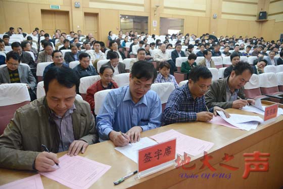 会议现场举行了签党风廉政建设责任书仪式。校党委书记郝翔、校长王焰新与二级单位代表机电学院、外国语学院、珠宝学院、基建处、档案馆的党政负责人现场签2014党风廉政建设责任制责任书,机电学院、外国语学院、珠宝学院、基建处、档案馆的党政负责人现场与签廉政承诺书,以保证党风廉政建设责任的落实。