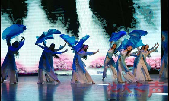 在唯美中国风的水墨画背景下,一段优雅的扇子舞拉开了晚会的帷幕。