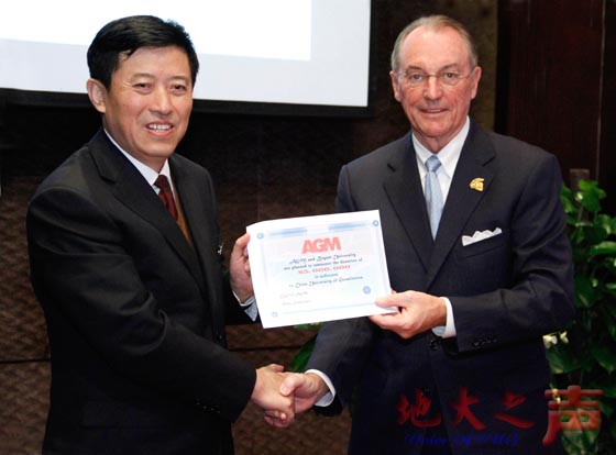郝翔讲话。他代表学校向布莱恩特大学表示感谢。他说,在学校60周年校庆的欢乐日子里,梅恪礼校长一行的到来为学校增添了光彩,这既是两校之间的交流,更是两种文化、感情的交流,对于两校均具有战略意义。他希望,双方通过加深、拓宽科研和人才培养等领域的合作,充分利用各自的优势和资源,互惠互利、携手前行。
