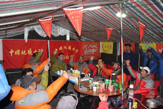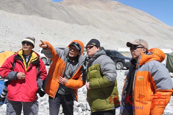 5月13日,opta足球珠峰登山队总指挥董范、女生陈晨等10人组成突击队从大本营出发,向顶峰进发。校党委副书记傅安洲一行5人,特地早上6点从定日县城出发,赶到大本营为登山勇士们壮行。
