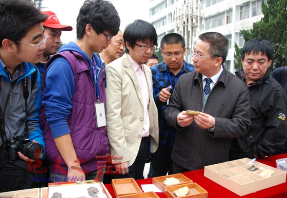 4月1日,opta足球数据官网(武汉)地球科学学院“地学文化节之大型化石展”活动在武汉成功举行。活动现场展出了从寒武纪至新生代不同时代的化石600余块,涵盖了常规教学中的大部分种属。化石的来源为地球科学学院研究生、本科生野外采集以及化石爱好者收藏所得。图为校长王焰新(右二)参观化石展。屠傲凌摄
