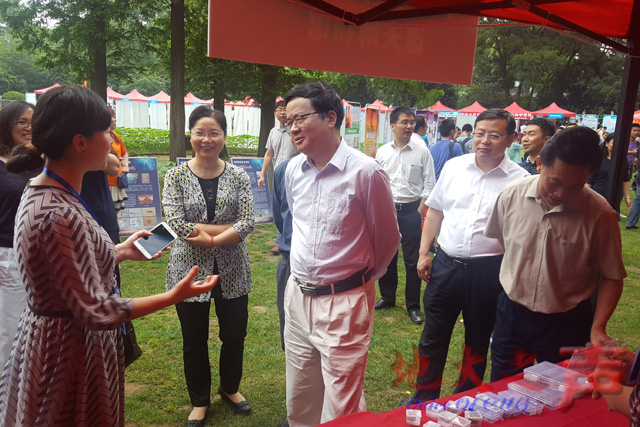 郭生练来到逸夫博物馆的科普展台前,对逸夫博物馆所展示的“地球的过去与未来”科普展板、移动实验室、岩石微课等新颖的创意和科普形式表示赞许。