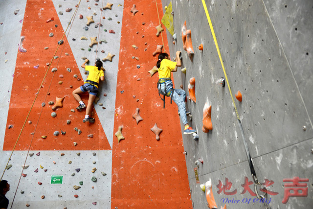 7月17日下午,营员们在攀岩馆体验攀岩项目。虽然酷暑难耐,但营员们体验地学文化的热情高涨。在教练的指导下,营员们分组进行了“春暖花开”、“天龙八部”、“兔子舞”等互动游戏。