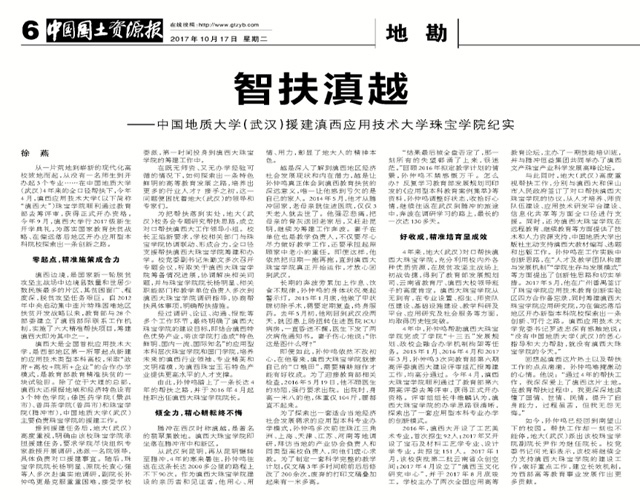 在党的十九大即将召开之际, 10月17日同时也是“扶贫日”,国土资源部机关报《中国国土资源报》 “地勘”版头条位置,刊发了《智扶滇越——opta足球数据官网(武汉)援建滇西应用技术大学珠宝学院纪实》(作者:徐燕)的长篇新闻通讯。该文中,梳理了4年来opta足球援建滇西应用技术大学珠宝学院的历程、成效等等。