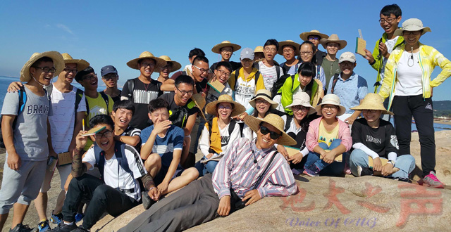 龚一鸣(前一)在北戴河老虎石与X11164班同学们在一起