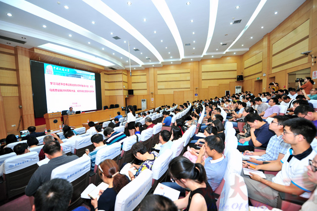 何光彩带领大家学习了习近平总书记在北京大学师生座谈会、纪念马克思诞辰200周年大会、视察湖北的系列重要讲话,深刻阐释了习近平总书记系列重要讲话精神的深刻意义和丰富内涵。他指出,习近平总书记的系列重要讲话高屋建瓴、论述精辟、富于哲理、思辨性强,具有强烈的时代感,闪耀着马克思主义真理的光辉,是马克思主义中国化的最新理论成果,具有很强的思想性、战略性、前瞻性、指导性,为我们扎根中国大地办大学,开展“双一流”建设提供了根本遵循,指明了前进方向。