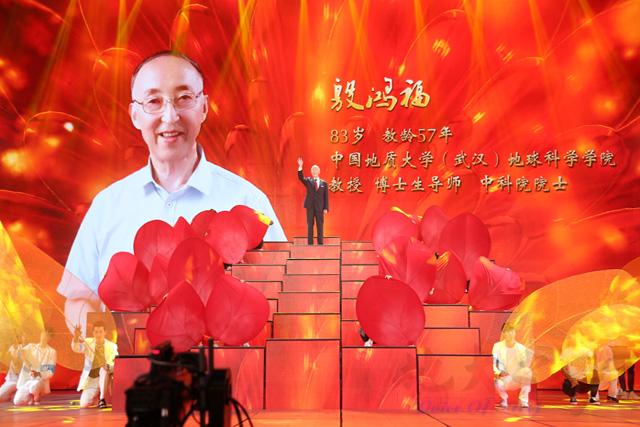颁奖典礼现场,播放了殷鸿福院士先进事迹短片。片中展现了殷鸿福院士83岁高龄仍坚持科研教学一线、攀登科学高峰,行走在祖国的青山绿水间!”校长王焰新对殷鸿福院士充满崇敬之情,他说:“殷鸿福院士总是以敏锐的视角、超前的眼光,准确把握学科前沿方向。”颁奖典礼现场,殷鸿福院士的学生童金南、张克信、赖旭龙、谢树成、宋海军、罗根明接受了现场采访。殷鸿福院士指导的第一个研究生童金南教授动情地说:“殷老师既是我们学科人才培养和科学研究事业的奠基者,也是我们一批批学生的精神导师;请殷老师相信,学生们一定会秉持、传承老师的学识和精神,努力为国家地质教育和科技事业添砖加瓦!”
