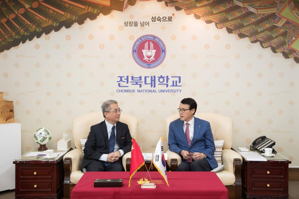 在韩国全北大学,王焰新与韩国国立全北大学校长李南浩、副校长郑成锡及相关负责人举行会谈。双方回顾了两校多年来紧密联系、推进合作的重要成果,确定两校将在前期合作的基础上,进一步加强两校教师间的交流学术与合作,支持鼓励两校教师联合申报中韩两国科学研究项目,不断拓展两校合作领域,提升合作层次。