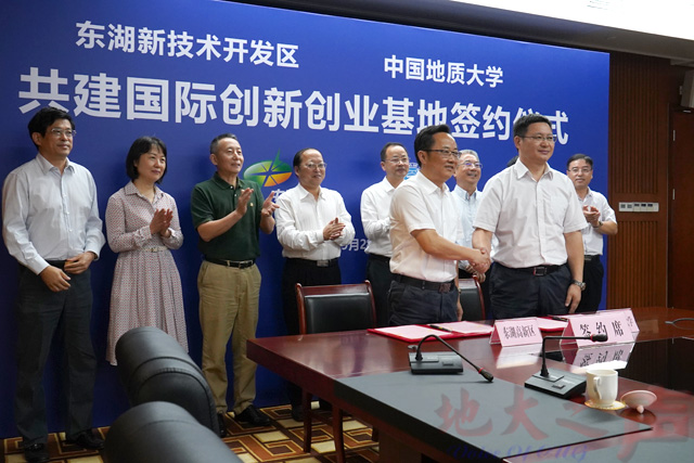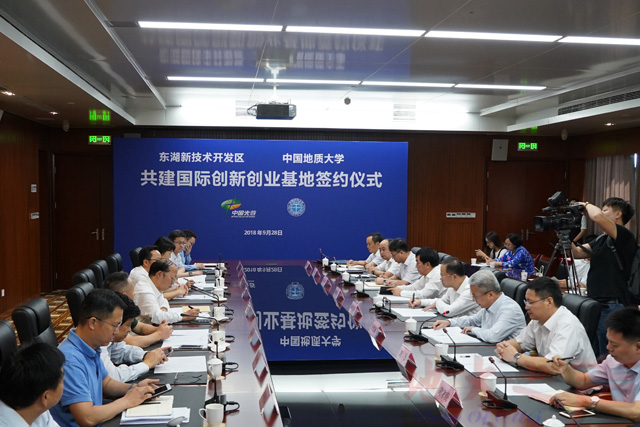 王焰新致辞。他认为,双方共建“国际创新创业基地”,是贯彻落实党的十九大精神,坚持创新是第一动力的生动体现;是遵循改革开放40年伟大实践经验,从开放走向更加开放的生动体现;是落实全国教育大会精神,“坚持优先发展教育事业”“坚持把服务中华民族伟大复兴作为教育的重要使命”的具体体现。他表示,学校将以基地建设为依托,深化市、区、校全面合作,通过努力,使这个基地成为地质资源环境领域国际人才汇聚的重镇、国际科技合作与交流的中心、“一带一路”人才培养的示范区、创新文化的集聚区。
