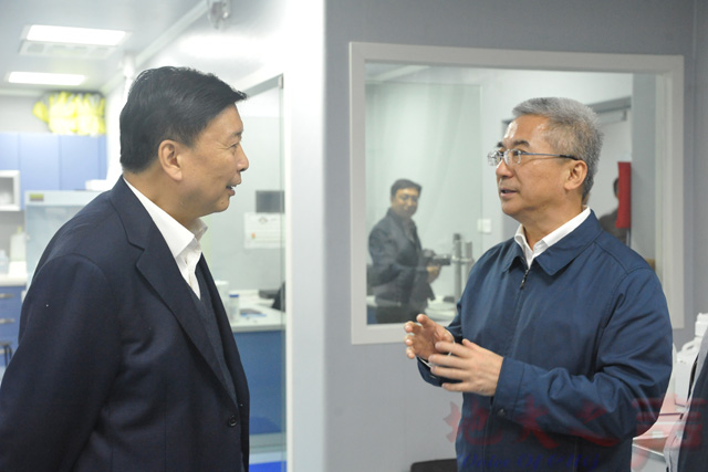 在国家地质环境修复技术创新平台培育基地,姜大明一行参观了相关实验室和自主研发的仪器、产品,基地主任、环境学院院长马腾教授汇报了平台在高砷地下水原位修复、固体废弃物处置与资源化、矿山生态环境修复与监控等多个领域关键修复技术和应用情况。姜大明在听取汇报后,对固废资源化利用等提出希望和要求。
