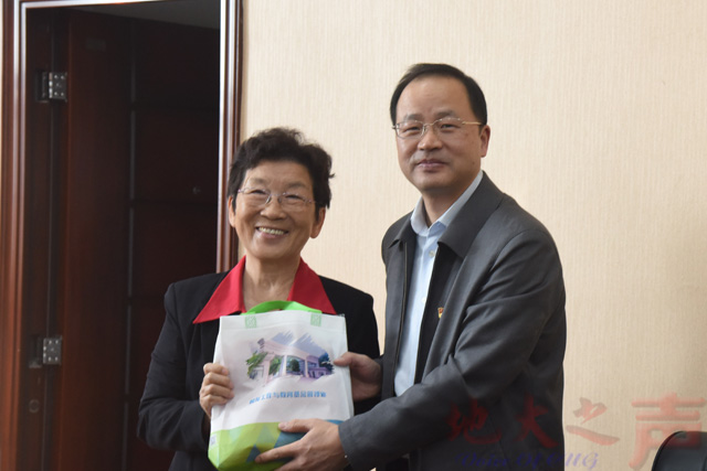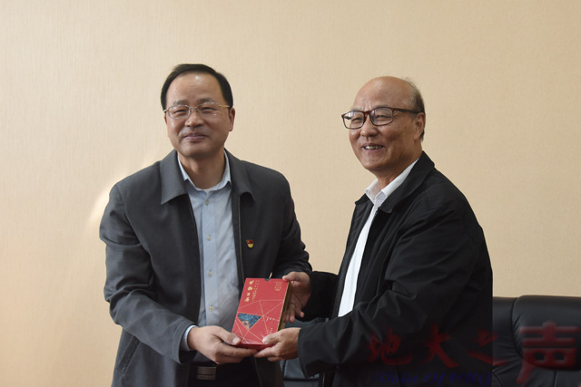 杨昌明代表研究生向学校赠送矿物精品日历。