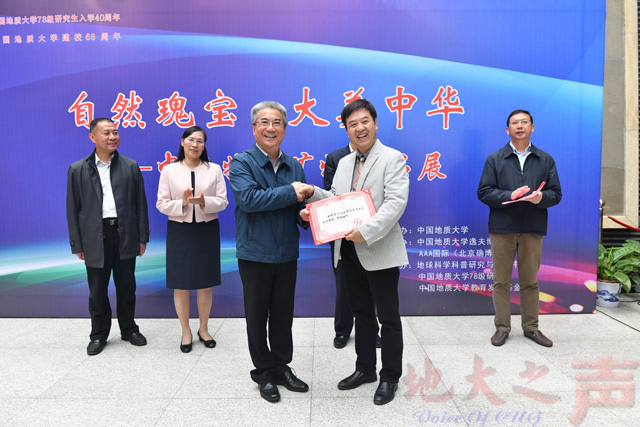 在展览现场,校友刘光华(前右)、杨彩萍夫妇代表1978级研究生向母校捐赠45件精品矿物标本。